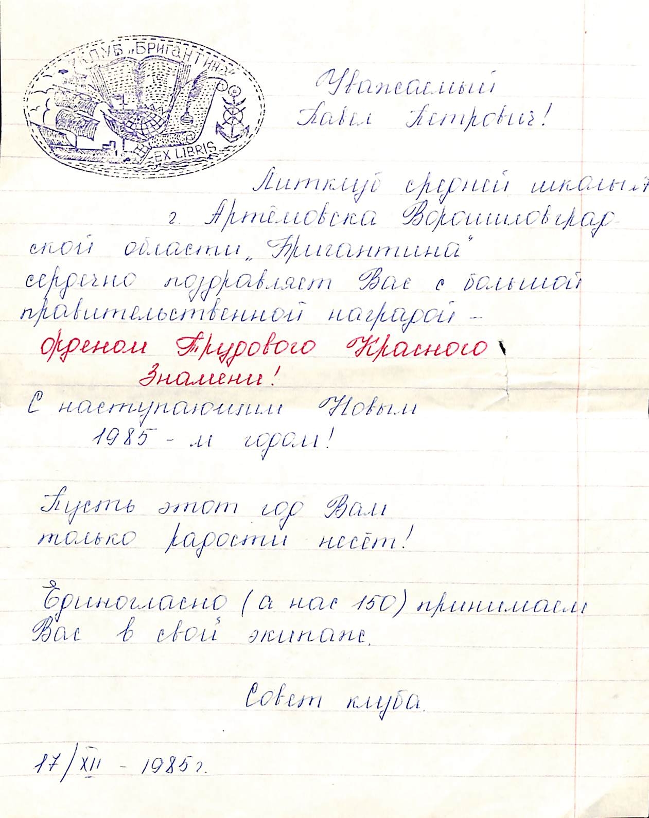 Boțu, Pavel. Manuscris olograf. Scrisoare fără plic adresată lui Pavel Boțu, Președinte al Uniunii Scriitorilor din Moldova de la membrii Clubului Literar „Brigantina”, Școala Nr. 7, orașul Artiomovsk, regiunea Voroșilovgrad, URSS din data de 17 decembrie 1985. Scrisoarea este inserată pe o pagină de caiet liniat pentru elevi, și este scrisă olograf în limba rusă cu stilou în culoare albastră și roșie. Pe prima pagină, sus colț stânga este imprimată Sigla Clubului Literar „Brigantina”. Scrisoarea conține un mesaj de felicitare adresat scriitorului Pavel Boțu, cu prilejul acordării: „Орденом Трудового Красного Знамени”. În partea inferioară a scrisorii este scrisă data: „17. 12. 1985. La scrisoare este atașat un desen în culori policrom: „Bilet de membru al Clubului ”Brigantina””.
