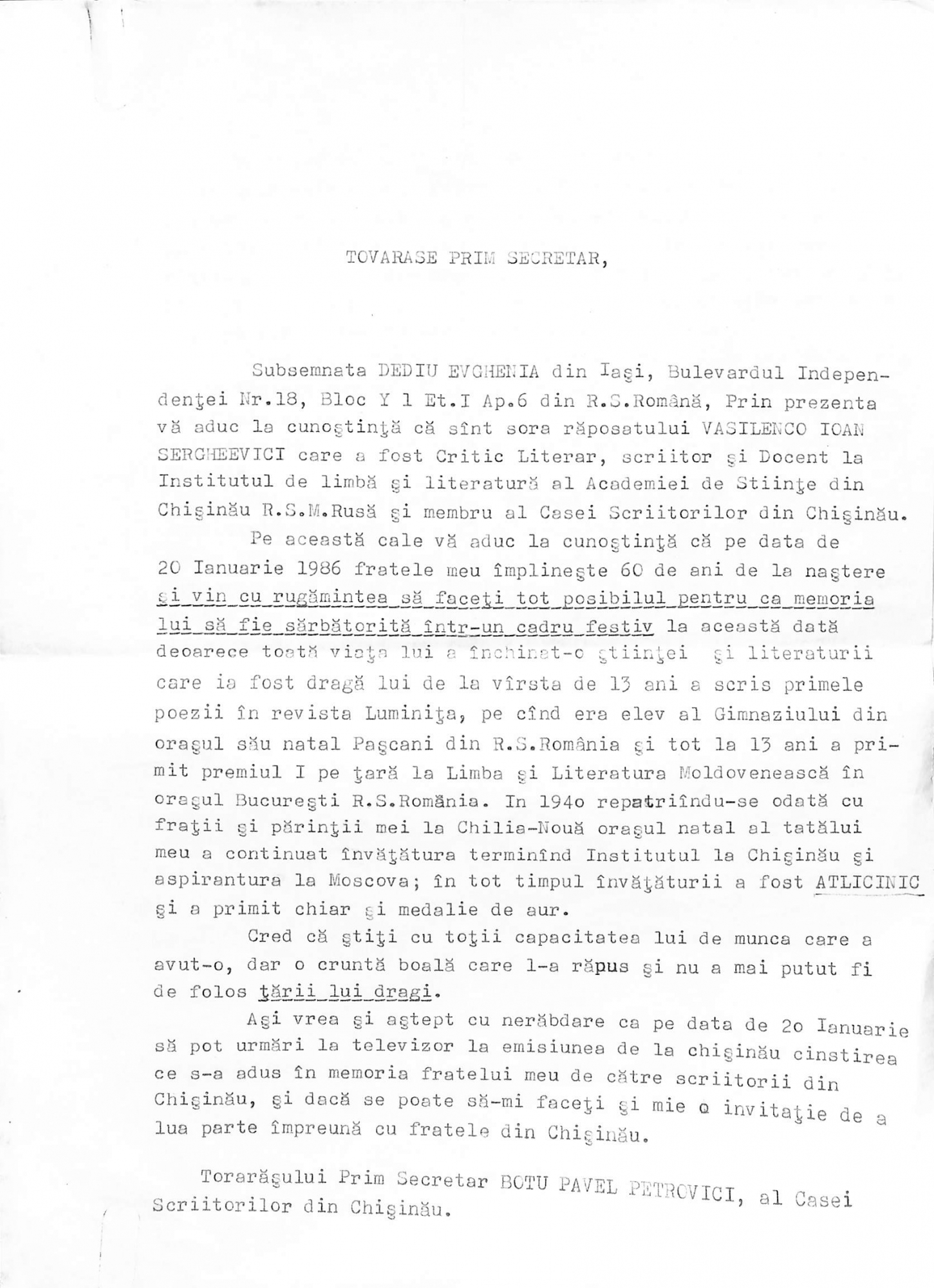 Boțu, Pavel. Manuscris dactilografiat. Scrisoare cu plic poștal adresată lui Pavel Boțu, Prim Secretar al Comitetului de Conducere al Uniunii Scriitorilor din RSSM, de la Dediu Evghenia Sergheevna, Iași, R. S. România. Scrisoarea este inserată pe două pagini și dactilografiată în limba română. Răvașul elucidează viața și activitatea lui Vasilenco Ioan Sergheevici, care a fost critic literar, scriitor și Docent la Institutul de Limbă și Literatură al Academiei de Științe din Chișinău. Autoarea scrisorii – sora lui Ioan Vasilenco, informează pe Prim Secretarul Uniunii Scriitorilor Boțu Pavel „...că pe data de 20 ianuarie 1986 fratele meu împlinește 60 de ani de la naștere și vin cu rugămintea să faceți tot posibilul pentru ca memoria lui să fie sărbătorită într-un cadru festiv la această dată deoarece toată viața lui a închinat-o științei și literaturii... Totodată Vă rog a dispune ca în muzeul de la Casa Scriitorilor unde este expusă fotografia fratelui meu să fie expusă și o autobiografie a lui din care să reiasă munca ce a depus-o în anii lui de viață și toate scrierile ce au fost scrise de el și editate, precum și dicționarul care l-a scris el și se folosește în toate școlile din republică, să fie expuse și cărțile scrise de el, așa cum se cuvine unui scriitor de talia lui. ...Tot pentru cinstirea memoriei fratelui meu vă aduc la cunoștință că pe data de 13 Martie 1987 se va împlini 10 ani de la data decedării lui cu care ocazie vă rog a interveni ...pentru a se pune o placă comemorativă la casa unde a trăit și a murit, adică pe strada Dimo nr.10/2”. Este semnătura olograf cu stilou în culoare albastră a Evgheniei Dediu. Pe partea anterioară a plicului sunt aplicate nouă timbre cu valoare nominală de cinci lei și un timbru cu valoare nominală de un leu, și legenda „ПОȘTA ROMÂNĂ”, sunt scrise adresele și aplicată ștampila oficiului poștal. Pe partea posterioară a plicului este aplicată ștampila oficiului poștal cu înscrisul: „Кишинёв. 18. 12. 85”. 2 p. L: 29,5 cm.; LĂ: 21 cm.; 1 plic poștal. L: 11,5 cm.; LĂ: 16 cm.