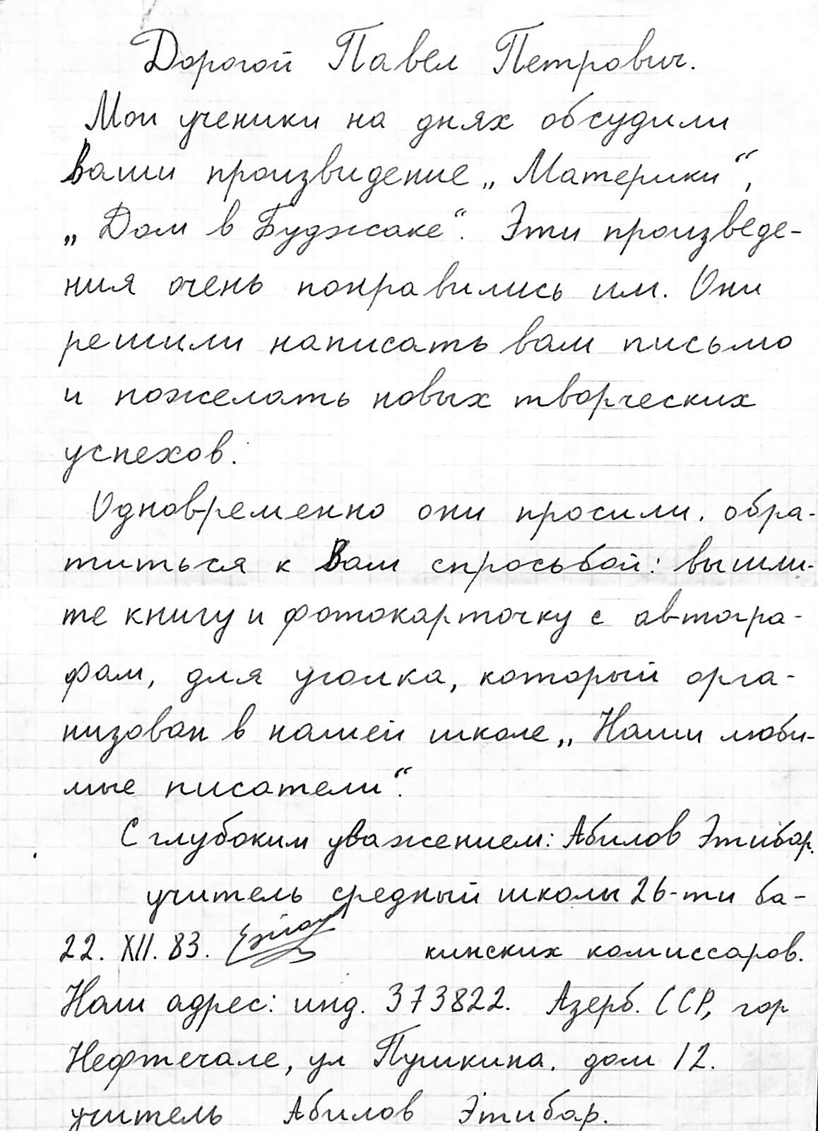 Boțu, Pavel. Manuscris olograf. Scrisoare fără plic adresată lui Pavel Boțu, Președinte al Uniunii Scriitorilor din Moldova de la Abilov Atibar, învățător, orașul Nefteceale, RSS Azerbaidjan din data de 22.12.1983, cu solicitarea de-a le remite fotografii și cărți cu autograful scriitorului Pavel Boțu. Scrisoarea este scrisă olograf în limba rusă cu stilou în culoare albastră și atașată o notiță scrisă cu stilou în culoare roșie. Este semnătura olograf a autorului.