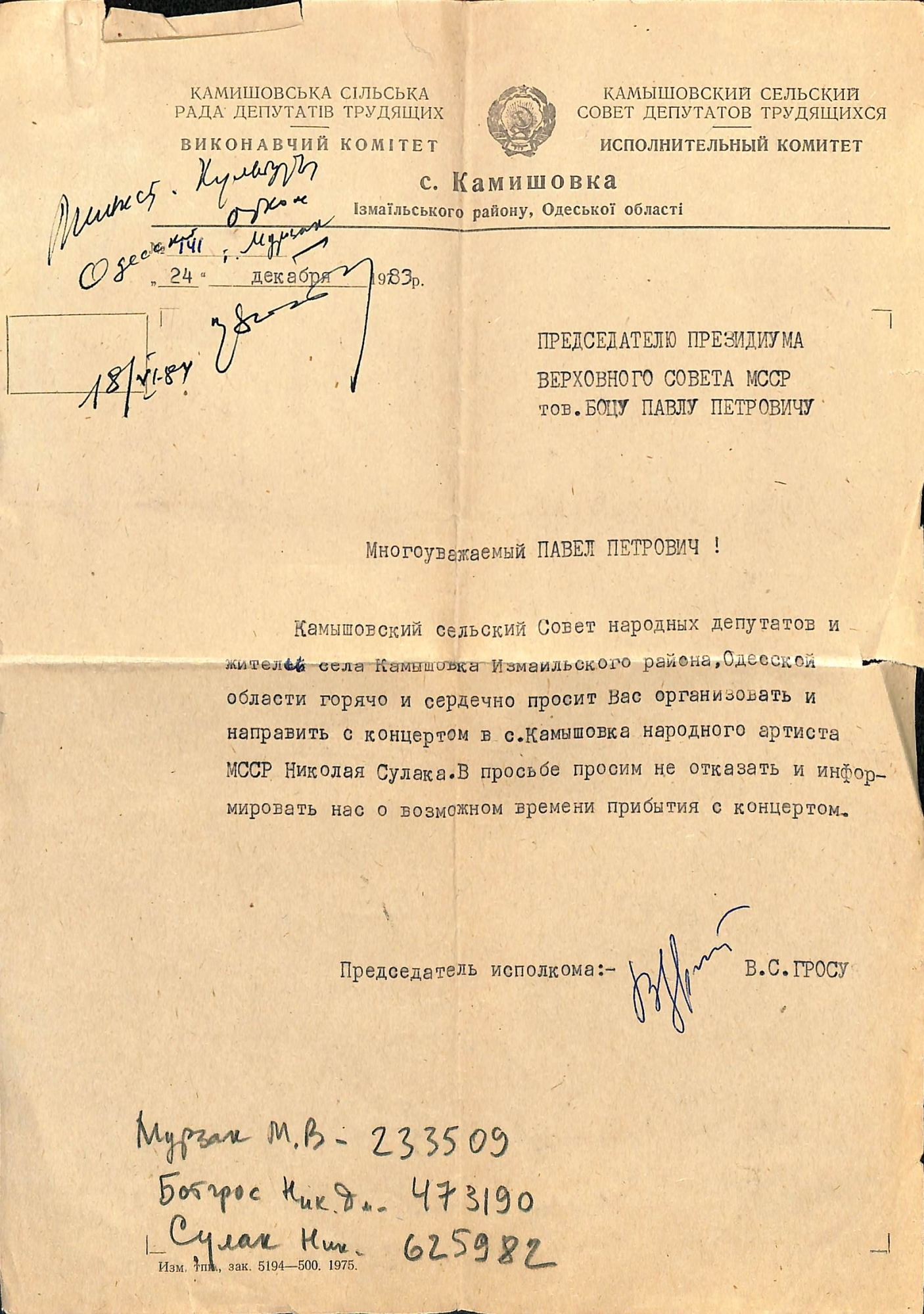 Boțu, Pavel. Manuscris dactilografiat. Scrisoare adresată lui Pavel Boțu, Președinte al Sovietului Suprem al RSSM, de la Grosu V., Președinte al Sovietului sătesc de deputați din satul Kamâșovca, raionul Ismail, regiunea Odesa. Scrisoarea Nr. 141 din 24 decembrie 1983 este dactilografiată pe formular-tip cu antetul instituției, sus la mijloc este imprimată stema RSSU. Textul este dactilografiat în limba rusă și este semnătura olograf a Președintelui executiv cu stilou în culoare albastră. Sus în partea stângă este scrisă rezoluția readresată Ministerului Culturii ... și data de: „18/ V. 84”. În partea inferioară a scrisorii sunt scrise numere de telefoane ale personalităților marcante din domeniul culturii: „ Murzac M.; Botgros N.; Sulac N.”. Scrisoarea conține o rugăminte către Pavel Boțu cu privire la organizarea și desfășurarea unui concert în satul Kamâșovca cu participarea maestrului Nicolae Sulac. 1 p. L: 29,5 cm.; LĂ:20,5 cm. Pe partea anterioară a plicului poștal sunt scrise adresele în limba rusă și aplicată ștampila oficiului poștal. La plic este atașat un formular-tip al oficiului poștal. Pe plic este un timbru fix cu valoare nominală de cinci copeici și legenda: „Почта СССР”. Pe partea posterioară a plicului este aplicată ștampila oficiului poștal cu înscrisul: „Кишинёв. 27. 12. 83”. 1 plic poștal. L: 11,5 cm.; LĂ: 15 cm.