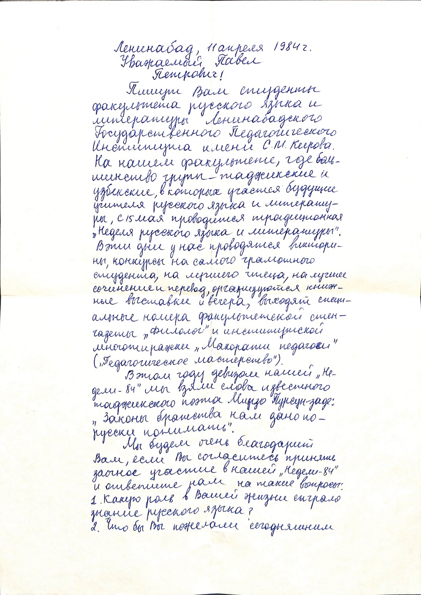 Boțu, Pavel. Manuscris olograf. Scrisoare cu plic adresată lui Pavel Boțu, Președinte al Uniunii Scriitorilor din Moldova de la studenții facultății de limba și literatura rusă a Institutului Pedagogic de Stat din orașul Leninabad, RSST. Scrisoarea este scrisă olograf în limba rusă cu stilou în culoare albastră. Sus este indicată data: „11 aprilie 1984”. Scrisoarea conține o rugăminte către scriitorul Pavel Boțu privind participarea la „Săptămâna - 84”. Sunt semnături olograf ale studenților. 2 p. L: 30 cm.; LĂ: 20,5 cm. Pe partea anterioară a plicului poștal sunt scrise adresele în limba rusă și aplicată ștampila oficiului poștal. Pe plicul poștal este un timbru fix cu valoare nominală de cinci copeici și legenda: „Почта СССР”. Pe partea posterioară a plicului este aplicată ștampila oficiului poștal cu înscrisul: „Кишинёв. 19. 04. 84”. 1 plic poștal. L: 11,5 cm.; LĂ: 16 cm.