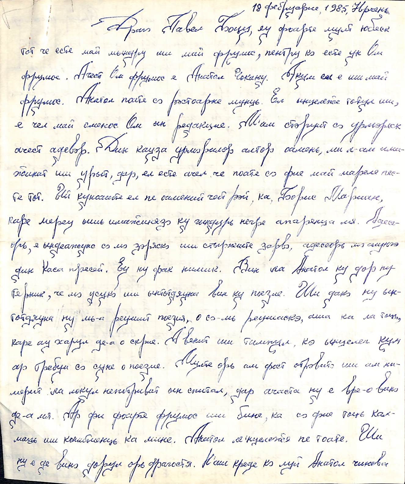 Boțu, Pavel. Manuscris olograf. Scrisoare adresată lui Pavel Boțu, Președinte al Uniunii Scriitorilor din Moldova de la Zinaida Ciorici din satul Iurceni, raionul Nisporeni din data de 18 februarie 1985. Pe prima pagină sus, colț dreapta este scris: „ 18 februarie 1985, Iurceni”. Textul este scris olograf în limba română cu caractere chirilice cu stilou în culoare albastră. Pe partea anterioară a plicului poștal sunt scrise adresele în limba rusă și aplicată ștampila oficiului poștal. Pe plicul poștal este un timbru fix cu valoare nominală de cinci copeici și legenda: „Почта СССР”. Pe partea posterioară a plicului este aplicată ștampila oficiului poștal cu înscrisul: „Кишинёв. 21. 02. 85”. Scrisoarea: 4 p. L: 20 cm.; LĂ: 16,5 cm. 1 plic poștal. L: 11 cm.; LĂ: 16 cm.