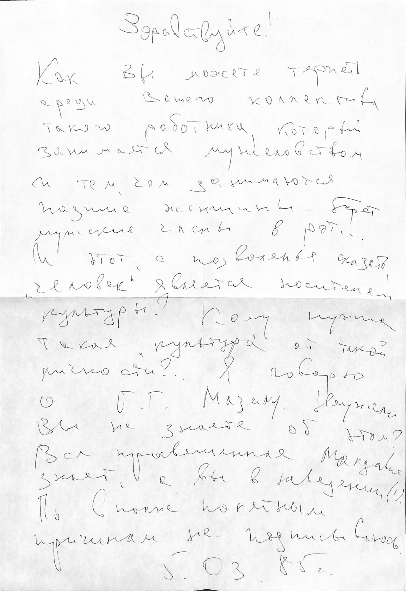 Boțu, Pavel. Manuscris olograf. Scrisoare anonimă cu plic poștal adresată lui Pavel Boțu, Președinte al Uniunii Scriitorilor din Moldova. Textul este scris olograf în limba rusă cu stilou în culoare albastră. Pe partea anterioară a plicului poștal este scrisă adresa Uniunii Scriitorilor în limba rusă și aplicată ștampila oficiului poștal cu înscrisul: „Кишинёв. 06. 03. 85”. Pe plicul poștal este un timbru fix cu valoare nominală de cinci copeici și legenda: „Почта СССР”. 1 p. Scrisoarea: L: 30 cm.; LĂ: 20 cm. 1 plic poștal. L: 11,5 cm.; LĂ: 16 cm.