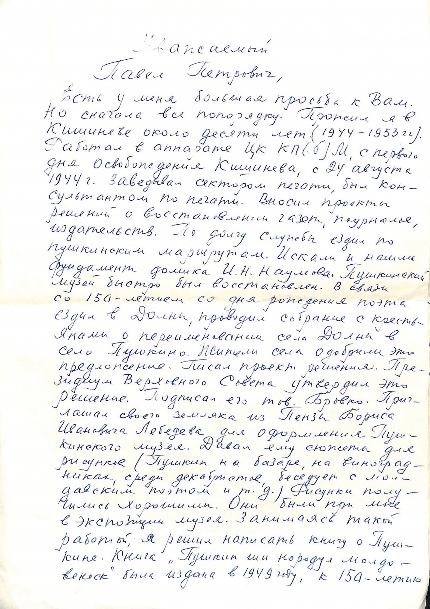 Boțu, Pavel. Manuscris olograf. Scrisoare cu plic adresată lui Pavel Boțu de la Injevatov I., orașul Saransk, RASSM din 16 august 1985. Scrisoarea este scrisă olograf în limba rusă cu stilou în culoare albastră. Este semnătura olograf a autorului scrisorii. Pe partea anterioară a plicului este un timbru fix cu valoare nominală de cinci copeici și legenda „ПОЧТА СССР”, sunt scrise adresele și aplicată ștampila oficiului poștal. Pe partea posterioară a plicului este aplicată ștampila oficiului poștal cu înscrisul: „Кишинёв. 23. 08. 85”. 3 p.
