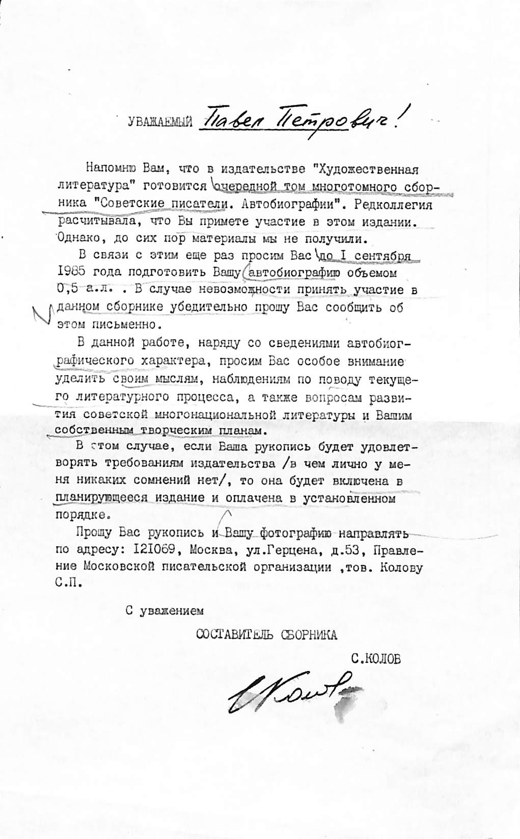 Boțu, Pavel. Manuscris dactilografiat. Scrisoare fără plic adresată lui Pavel Boțu, Președinte al Uniunii Scriitorilor din Moldova de la Kolov S., Uniunea Scriitorilor, orașul Moscova, URSS. Scrisoarea este dactilografiată în limba rusă și conține informația cu privire la prezentarea materialelor până la 01 septembrie 1985 pentru editarea culegerii: „Советские писатели. Автобиографии”. Este semnătura olograf a autorului scrisorii cu stilou în cerneală neagră.