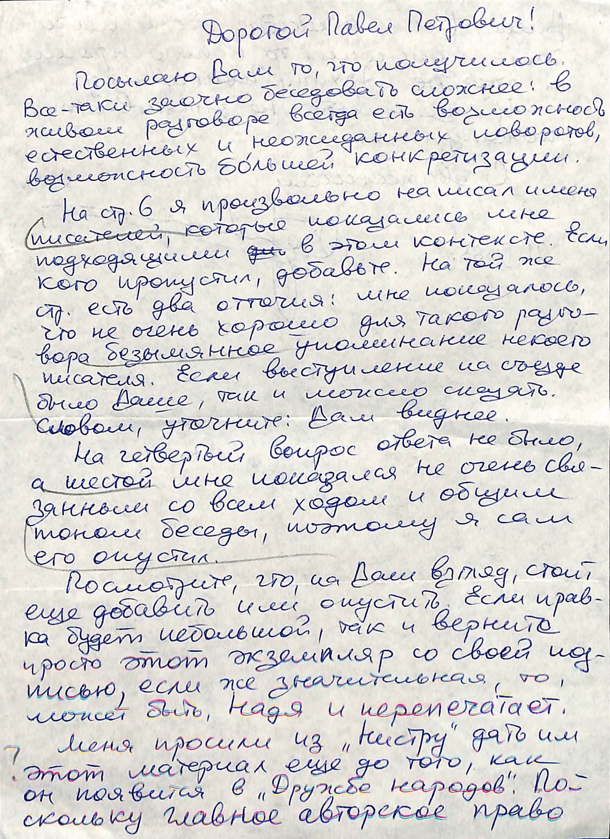Boțu, Pavel. Manuscris olograf. Scrisoare fără plic adresată lui Pavel Boțu, scrisă olograf în limba rusă cu stilou în culoare albastră. Este semnătura olograf ilizibil și data: „21. IX. 85”.
