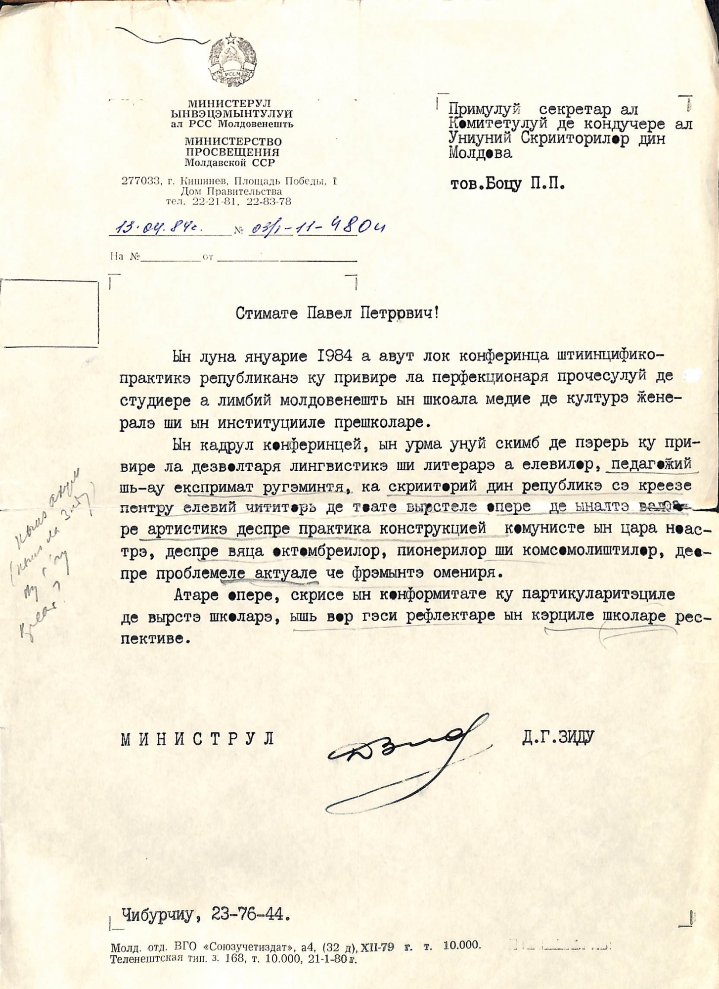 Boțu, Pavel. Manuscris dactilografiat. Scrisoare adresată Primului secretar al Comitetului de conducere al Uniunii Scriitorilor din Moldova, Boțu Pavel de la Ministrul Învățământului al RSS Moldovenești, Zidu Dumitru, Nr. 03/1-11-4804 din 13. 04. 1984. Scrisoarea este inserată pe formular-tip cu antetul instituției, sus în partea stângă este stema RSS Moldovenești. Scrisoarea relevă rezultatele conferinței științifice cu privire la perfecționarea procesului de studiere a limbii moldovenești în școala medie de cultură generală și în instituțiile preșcolare. Scrisoarea este dactilografiată în limba română cu caractere chirilice. Pe marginea din partea stângă a scrisorii este scris olograf cu creion simplu în culoare neagră. Este semnătura olograf a Ministrului Dumitru Zidu, scrisă olograf cu stilou în cerneală neagră, iar mai jos este executorul și telefonul acestuia.