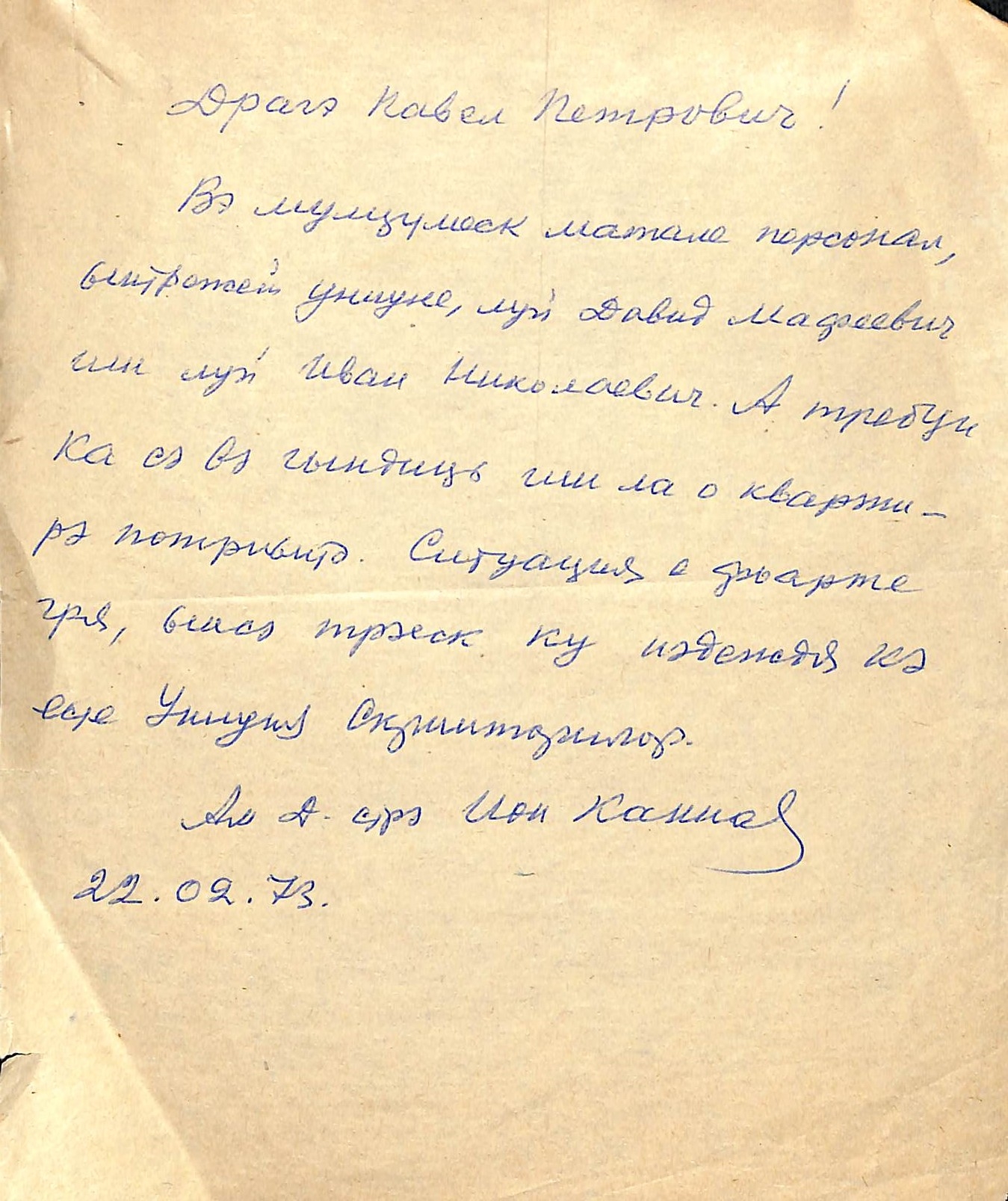 Boțu, Pavel. Manuscris olograf. Scrisoare cu plic adresată scriitorului Pavel Boțu de la scriitorul Ion Canna la data de 22. 02. 1973. Text scris olograf în limba română cu caractere chirilice cu stilou în culoare albastră. Este semnătura olograf a scriitorului Ion Canna. 1 p. L: 20,5 cm. ; LĂ: 17 cm. Pe partea anterioară a plicului este aplicată ștampila oficiului poștal cu data de: „22. 02. 73” și adresa: „г. Кишинёв ул. Киевская, 115. Союз Совет. писателей Молдавий. т. Боцу Павлу Петровичу”, iar mai jos este scrisă adresa lui Ion Canna. Pe partea posterioară a plicului: fără informații olograf, este aplicată ștampila oficiului poștal cu data de: „23. 02. 73”. 1 plic poștal. L: 11 cm.; LĂ: 15,5 cm.
