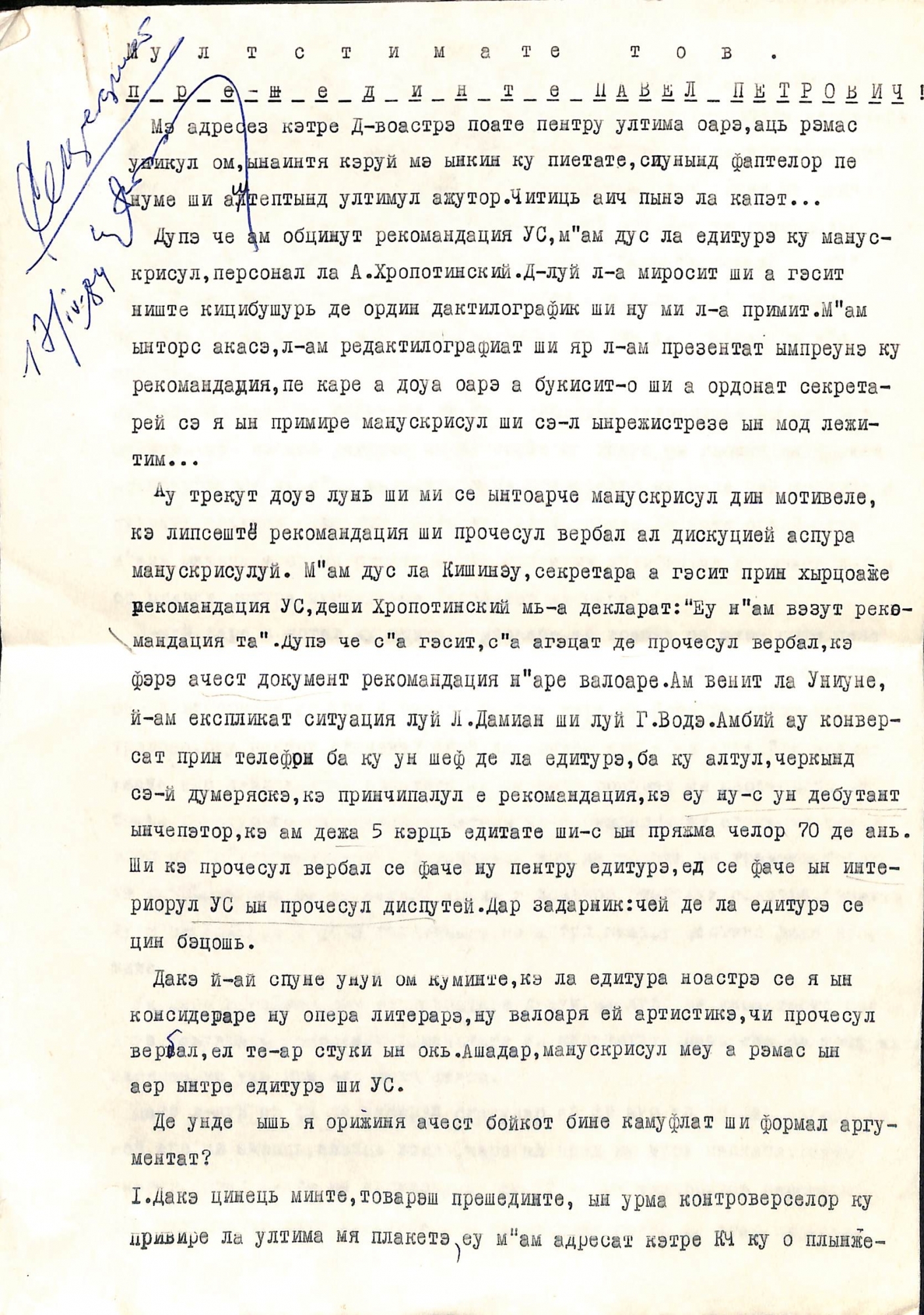 Boțu, Pavel. Manuscris dactilografiat. Scrisoare fără plic adresată lui Pavel Boțu, Președinte al Uniunii Scriitorilor din Moldova de la scriitorul Nicolae Țurcanu, cu privire la manuscrisul pregătit pentru editare. Scrisoarea dactilografiată este scrisă în limba română cu caractere chirilice și corectări scrise olograf cu stilou în culoare albastră și creion simplu în culoare neagră. Este semnătura lui Nicolae Țurcanu scrisă olograf cu stilou în cerneală albastru-violet. Pe prima pagină sus colț stânga este scris olograf cu stilou în culoare albastră indicația, data și semnătura olograf a lui Pavel Boțu. Este indicată data: 17. 04. 1984.