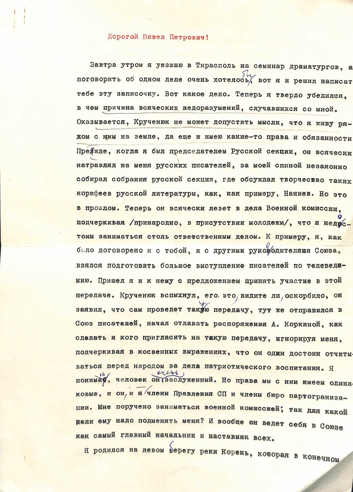 Boțu, Pavel. Scrisoare adresată lui Pavel Boțu de la Nicolae Savostin. Text dactilografiat în limba rusă cu litere în culorile roșu, negru, și corectări scrise olograf cu stilou în culoare albastră. Este semnătura olograf a lui Nicolae Savostin cu stilou în culoare albastră și data: „22. XI. 77”. La scrisoare sunt atașate două notițe adresate lui Pavel Boțu: „Надя! Передай это лично Боцу. Н. Савостин.”; „П. П. здесь твои стихи а также моё письмо к тебе. H. Савостин.”. 2 p. L: 29,5 cm.; LĂ: 20,5 cm. și 2 notițe de mici dimensiuni. Pe plicul simplu este scris: „Павлу Петровичу Боцу (лично)”. 1 plic simplu. L: 12 cm. ; LĂ: 18 cm.