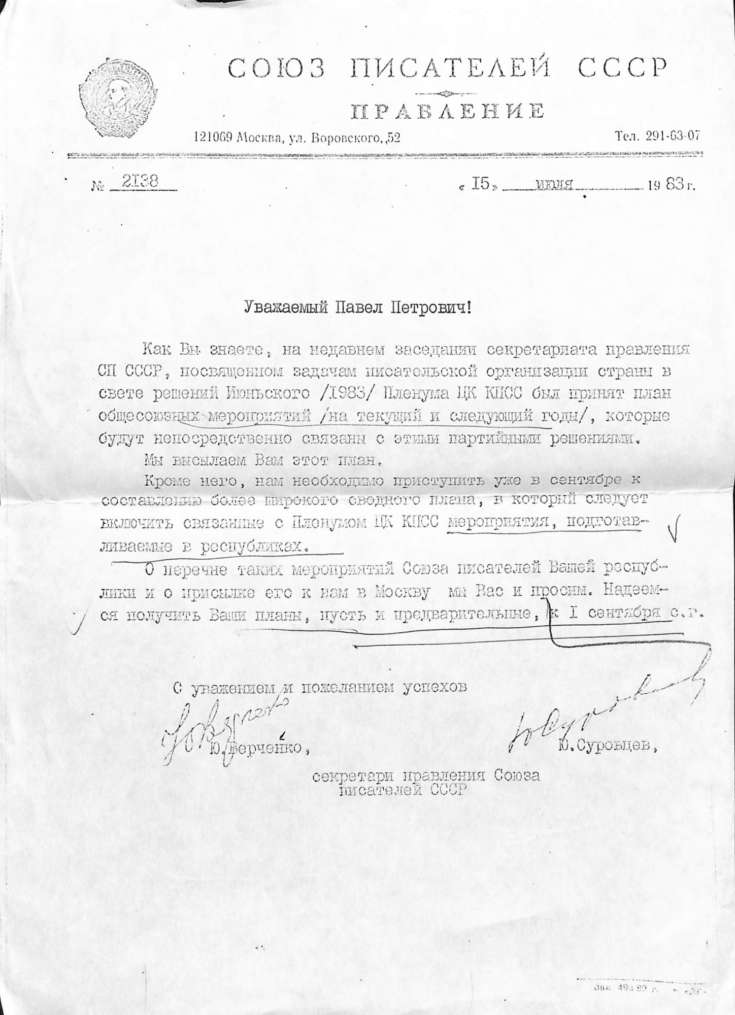 Boțu, Pavel. Scrisoare adresată lui Pavel Boțu, Președinte al Uniunii Scriitorilor din Moldova de la Secretarii Uniunii Scriitorilor din URSS, Nr. 2138 din 15 iulie 1983, cu privire la realizarea prevederilor Hotărârii Plenarei CC al PC al URSS din iulie 1983. Scrisoarea este dactilografiată pe formular-tip cu antetul instituției, în partea stângă sus este imprimată stema URSS. Text scris în limba rusă, sunt semnăturile olograf cu stilou în culoare neagră a Secretarilor US din URSS: „Ю. Верченко; Ю. Суровцев”, Moscova, 1983. 1 p. L: 29,5 cm.; LĂ:21 cm.