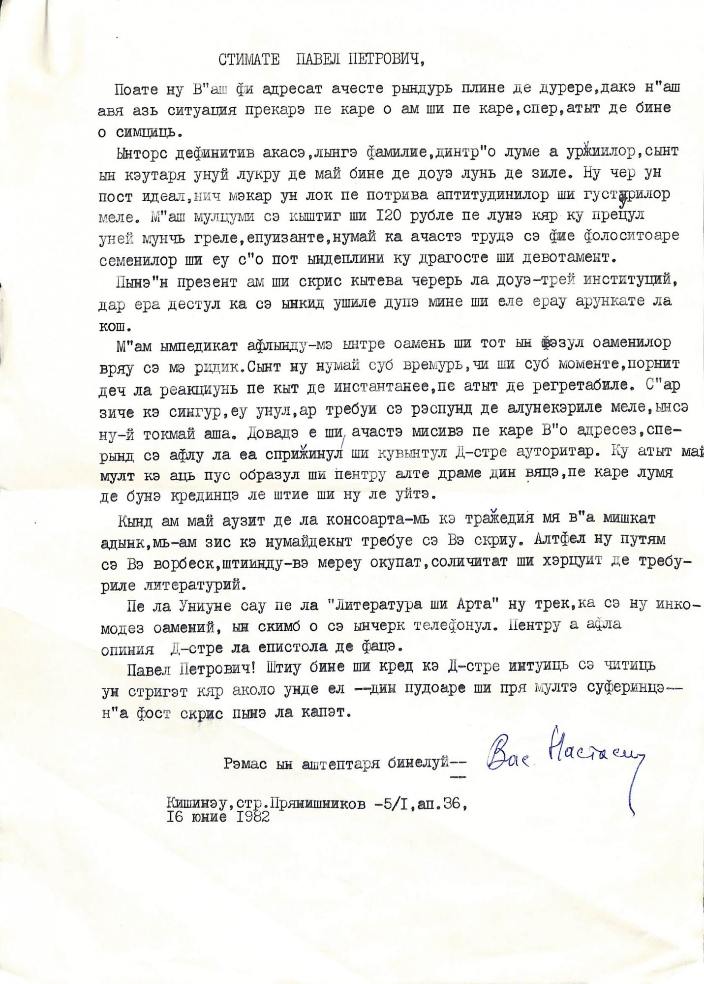 Boțu, Pavel. Scrisoare adresată lui Pavel Boțu de la Vasile Nastasi, orașul Chișinău din data de 16 iunie 1982. Scrisoarea este dactilografiată în limba română cu caractere chirilice, iar notița atașată scrisorii este scrisă olograf cu stilou în culoare albastră și creion în culoare roșie. Este semnătura olograf a autorului cu stilou în culoare albastră.