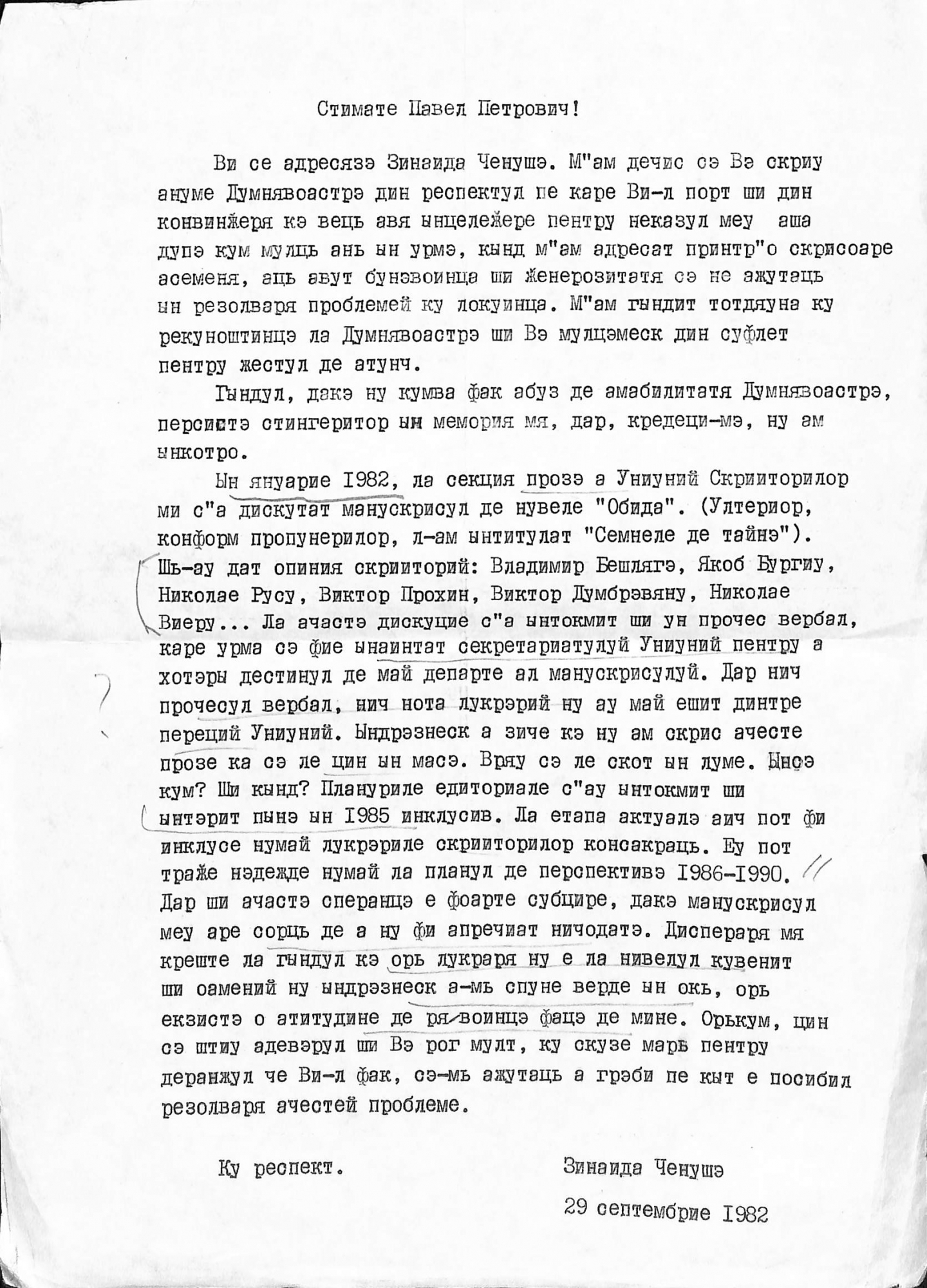 Boțu, Pavel. Scrisoare fără plic adresată lui Pavel Boțu, Președinte al Uniunii Scriitorilor din Moldova de la scriitoarea Zinaida Cenușă din data de 29 septembrie 1982. Scrisoarea este dactilografiată în limba română cu caractere chirilice.