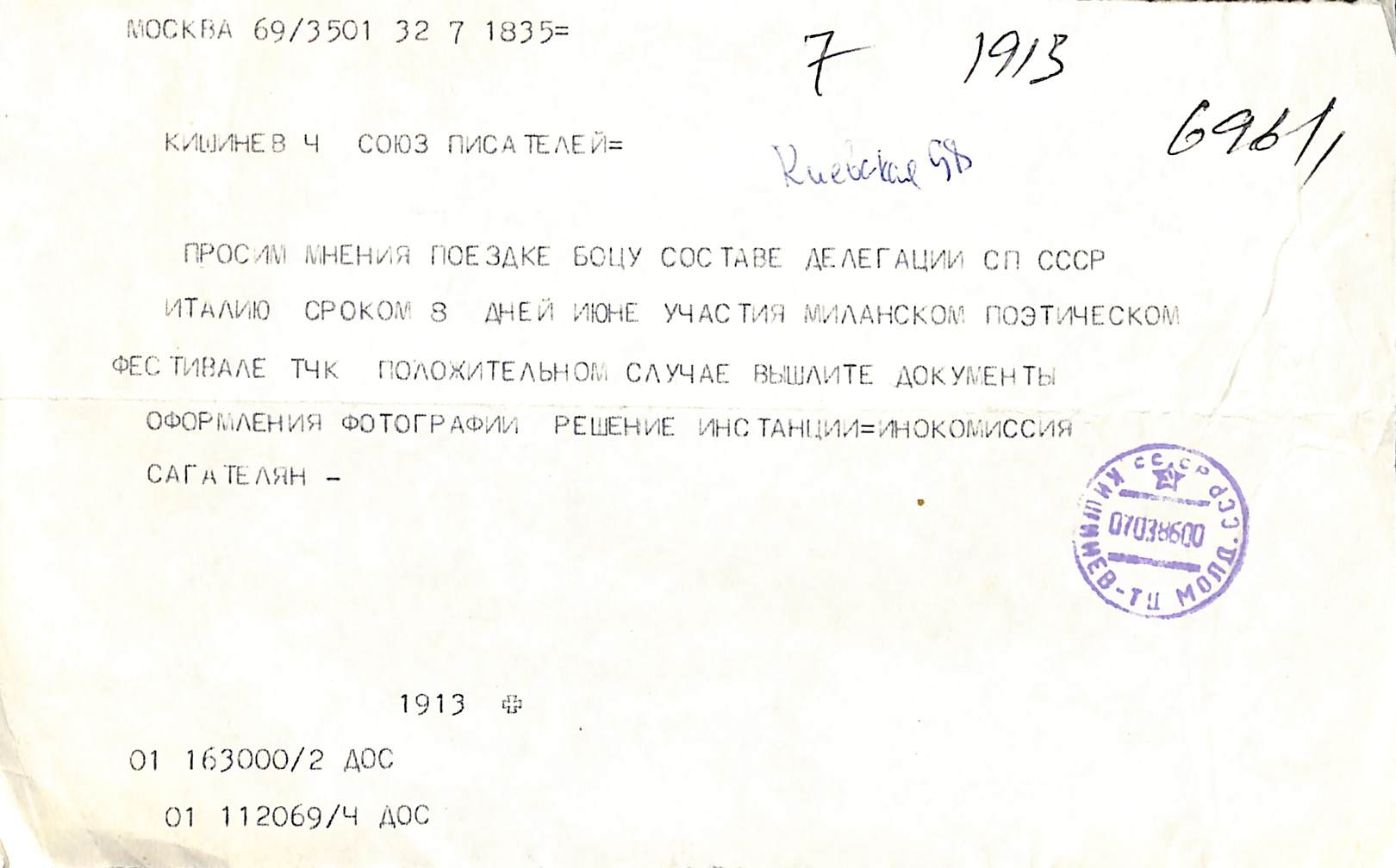 Boțu, Pavel. Manuscris dactilografiat. Telegramă adresată lui Pavel Boțu, Președinte al Uniunii Scriitorilor din Moldova cu privire la deplasarea preconizată în orașul Milano, Italia. Telegrama este dactilografiată în limba rusă și este recepționată din orașul Moscova, URSS. Este aplicată ștampila oficiului poștal cu înscrisul: „Кишинёв. 07. 03. 86”. La telegramă este atașată o notiță cu nume, prenume; numere de telefoane.
