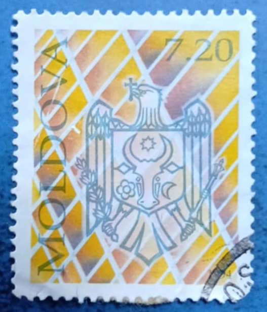 Timbru poștal al Republicii Moldova, cu valoarea nominală de 7.20 lei, ilustrând stema națională. Emis după obținerea independenței, simbolizează identitatea și suveranitatea țării.