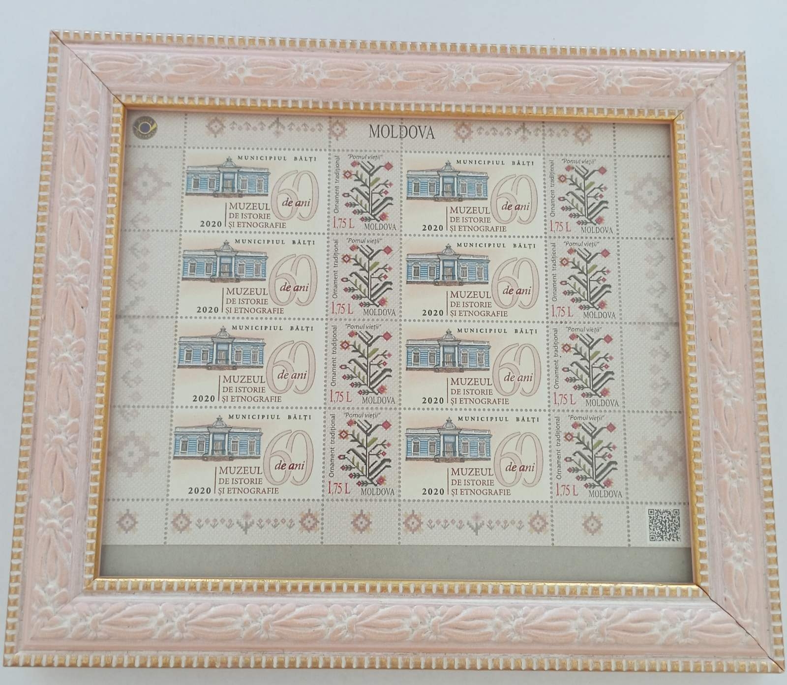 Colița conține 16 timbre poștale: 8 timbre cu desenul clădirii, în partea de jos scrisă denumirea muzeului, în partea de sus ,,Municipiul Bălți” și pe dreapta ,,60 de ani”, timbrul este tipărit pe fundalul alb-bej; 8 timbre cu ornament tradițional ,,Pomul vieții”, este indicată valoarea nominală a timbrului ,,1,75 L”, în partea de jos este scris ,,MOLDOVA”. În colțul stâng sus este reprezentat logo-ul Poștei Moldova, în partea de jos colțul drept QR cod care conține informația: ,,Mărci personalizate – 2013; Design: A. Kornienko”. Colița este amplasată într-o ramă pentru fotografii. Cromatica coliței: bej, galben, albastru, verde, roșu. Cromatica ramei: bej, auriu.