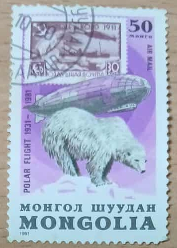 Timbru poștal aerian emis de Mongolia în 1981, pentru a marca 50 de ani de la Zborul Polar din 1931 cu dirijabilul german Graf Zeppelin. Ilustrează un urs polar, dirijabilul și un timbru sovietic reprodus. Fundal violet intens. Stare: folosit (ștampilat).