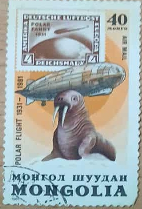 Timbru mongol aerogram “Air Mail” emis în 1981 cu tema „50 de ani de la zborul polar al Graf Zeppelin”. În centru apare o rachetă în zbor, iar dedesubt un animal marin (focă Weddell). În colțul stânga sus apare un mini‑timbru suplimentar (“stamp‑on‑stamp”) .
