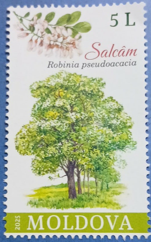Timbru poștal emis de Republica Moldova în anul 2025, cu valoarea nominală de 5 lei, reprezentând arborele Salcâm (Robinia pseudoacacia), însoțit de detaliu floral.