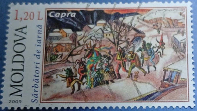 Timbrul emis de Republica Moldova în 2009, cu valoarea nominală de 1,20 lei, ilustrează tradiția folclorică a sărbătorilor de iarnă, reprezentând dansul „Capra”. Imaginea surprinde personaje costumate în măști și straie tradiționale care aduc veselie și noroc în comunitate, reflectând bogăția patrimoniului cultural moldovenesc.