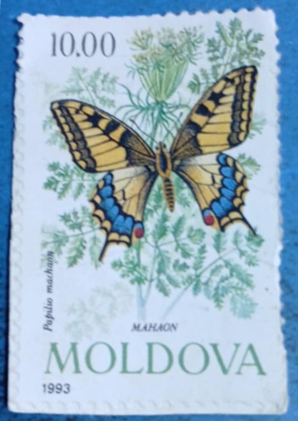 Timbru poștal emis în Moldova în 1993, cu valoarea nominală de 10.00. Prezintă imaginea fluturelui Papilio machaon (Mahaon), ilustrat pe un fundal cu frunze verzi. Timbrul evidențiază frumusețea naturii și biodiversitatea specifică regiunii.