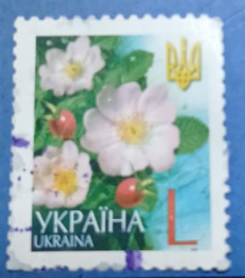 Timbru poștal modern al Ucrainei, ilustrând flori sălbatice cu fructe roșii, pe fundal verde-albastru, având în colțul superior drept simbolul național Tryzub galben. Valoarea nominală este exprimată prin litera „L”, specifică tarifelor poștale actuale. Timbrul reflectă patrimoniul natural și identitatea națională a Ucrainei.