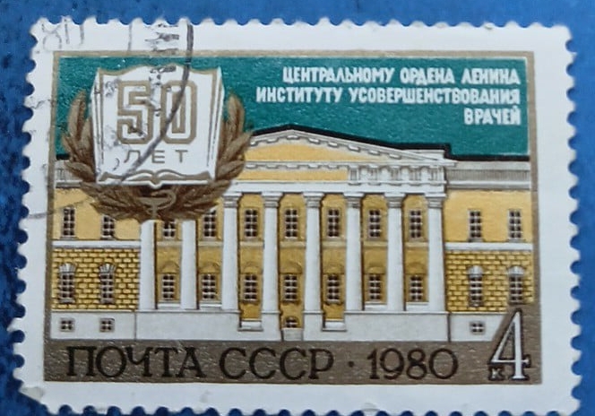 Timbru poștal sovietic - "50 de ani Institutul Central Lenin pentru Perfecționarea Medicilor"