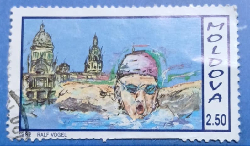 Timbru poștal, emis de Republica Moldova în anul 1998. Realizat de artistul Ralf Vogel, timbrul prezintă un înotător în stil fluture surprins în timpul competiției într-o compoziție picturală ce îmbină dinamismul sportiv cu eleganța estetică.