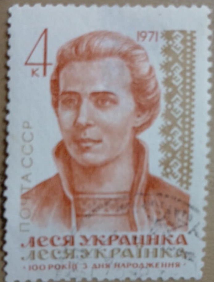 Timbru sovietic din 1971, dedicat poetesei ucrainene Lesya Ukrainka, comemorând 100 de ani de la naștere.