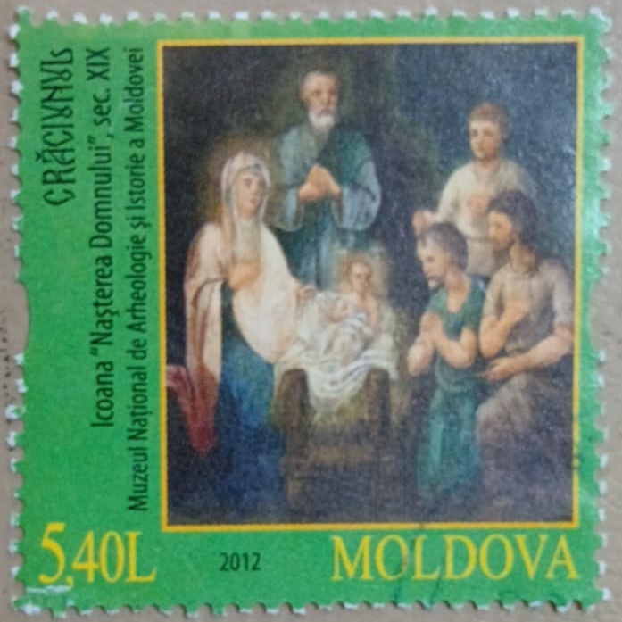 Timbru reprezintă o icoană religioasă din secolul al XIX-lea, intitulată „Nașterea Domnului”. Este o reprezentare clasică a nașterii lui Iisus Hristos, cu personaje din tradiția creștină, inclusiv Maria, Iosif și alte figuri. Aceasta face parte din colecția Muzeului Național de Arheologie și Istorie a Moldovei.
