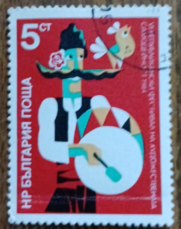 Timbru poștal emis de Republica Populară Bulgaria în 1984, cu valoarea de 5 stotinki, dedicat Săptămânii Mondiale a Artei Amatorilor. Ilustrează un muzicant popular stilizat, cu tobă și pasăre decorativă, reprezentând tradiția și creativitatea populară.