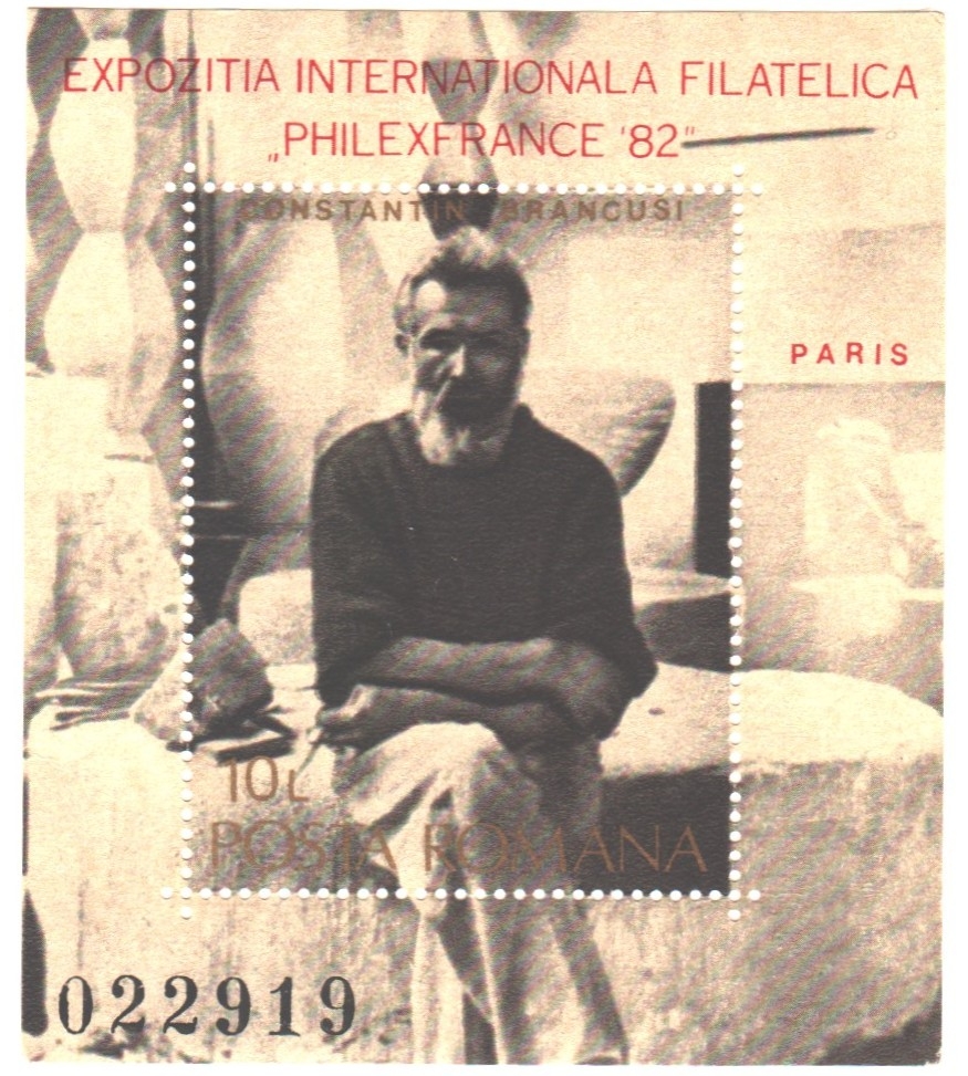 Coliță de formă dreptunghiulară, având în centru o marcă poștală, ce reproduce un portret fotografic al sculptorului Constantin Brâncuși (1876–1957), sculptor român de renume mondial, surprins în atelierul său, înconjurat de elemente sculpturale. Figura este redată frontal, într-o atitudine contemplativă, sugerând relația directă dintre artist și actul creației. În partea superioară este înscrisă denumirea evenimentului: „EXPOZIȚIA INTERNAȚIONALĂ FILATELICĂ PHILEXFRANCE ’82”, iar în dreapta, localizarea „PARIS”. Marca poștală poartă valoarea nominală de 10 lei și mențiunea „POȘTA ROMÂNĂ”. În partea inferioară a blocului este tipărit un număr de serie: [022919]. Tiraj: 190000. Această piesă filatelică a fost emisă de Poșta Română cu prilejul Expoziției Internaționale Filatelice „ PHILEXFRANCE ’82”, desfășurată la Paris, eveniment de referință pentru filatelia mondială. Numerotarea individuală din colțul inferior indică tirajul limitat și statutul său de obiect destinat colecționarilor și expunerii muzeale; nu a fost conceput pentru circulație poștală curentă.