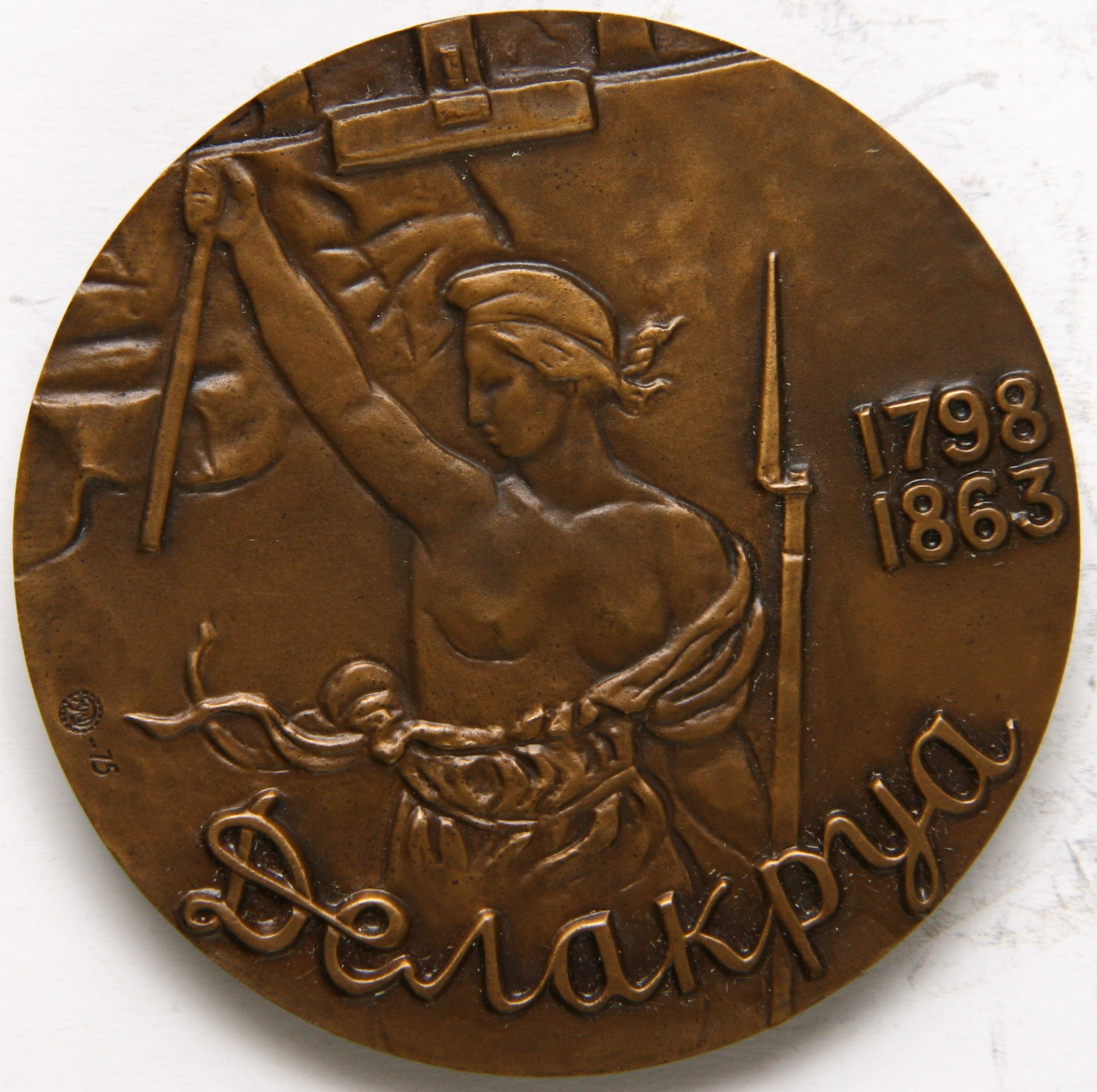 Avers: efigia pictorului Eugene Delacroix, 3/4 stg; margine drp - numele meșterului medalier.