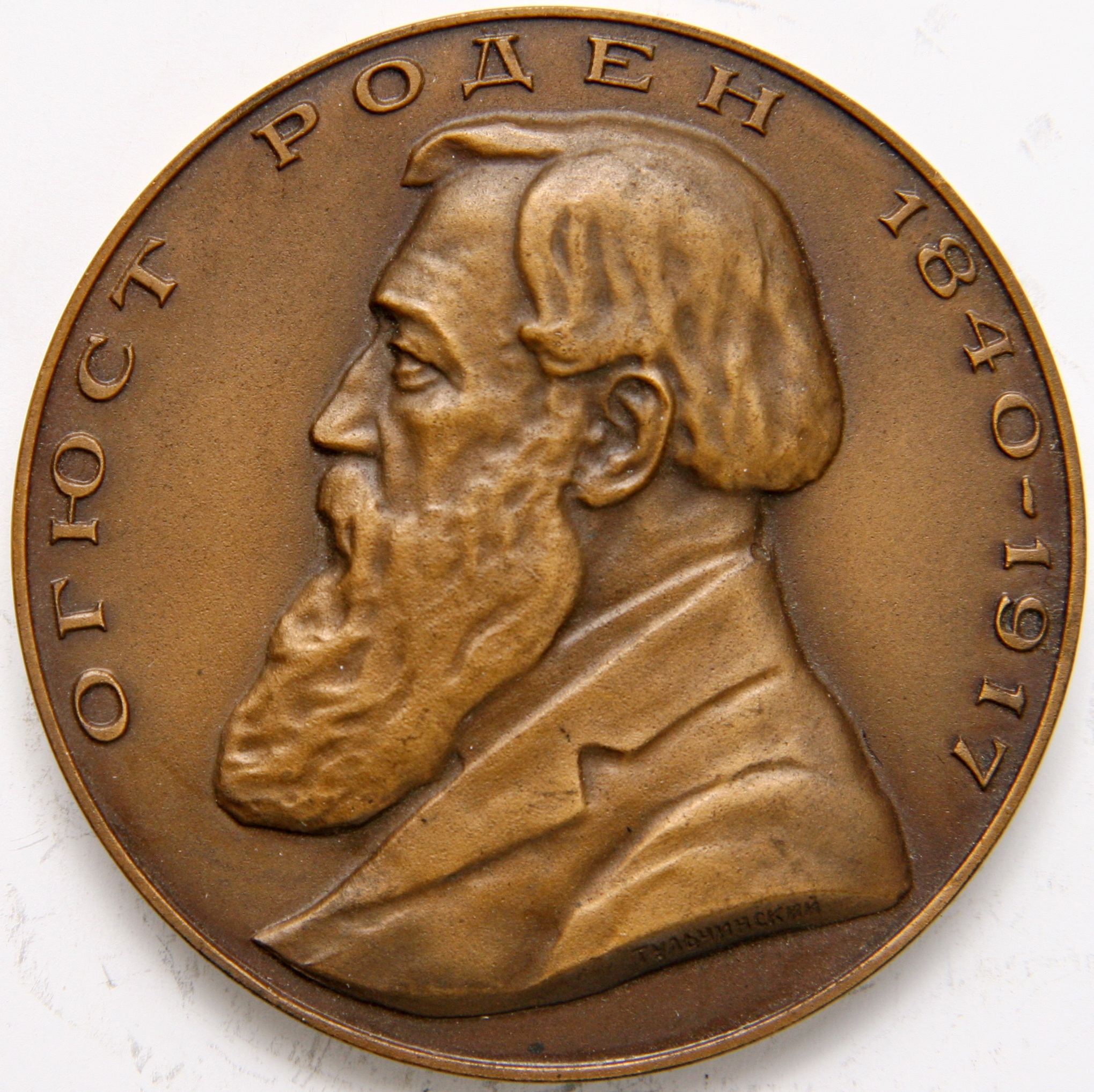 rotundă cu muchie netedă. Avers: efigia lui August Rodin în profil stg; în jurul valorii - inscripții, pe tăietura mînecii - numele meșterului medalier. Revers: legenda în 5 rînduri.