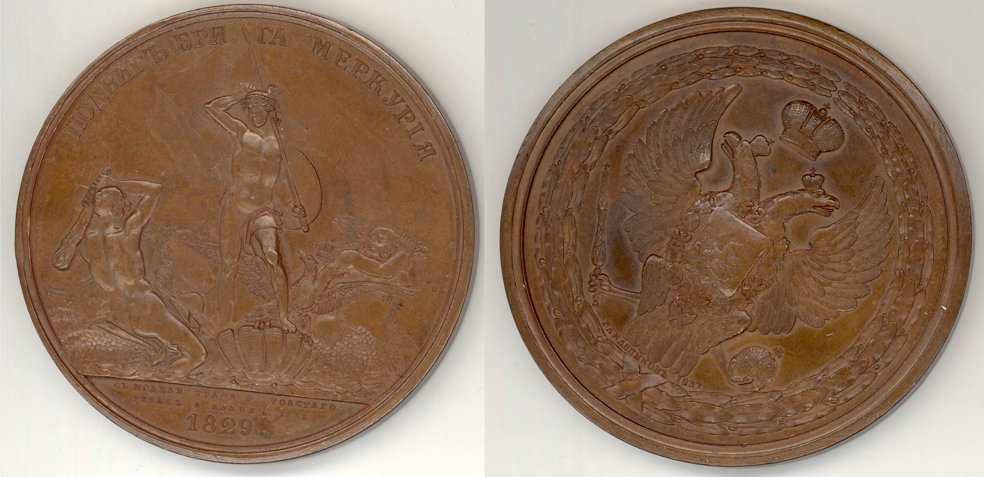Medalie rotundă, cu muchie netedă. Avers: scenă de bătălie cu imaginea zeului Mercur care apare învingător în lupta cu cei doi. Sus, în arc de cerc - legenda: Подвиг брига Меркурия, jos în exergă: сь модели графа Ф. Толстаго… şi milesimul 1829. Revers: acvilă bicefală încoronată cu aripi desfăcute, ţine în drp sceptrul, în stg - sfera cruciferă, pe piept are un scut cu imaginea Sf. Gheorghe ucigînd Balaurul. Sub imagini - inscripţii. Margine - motiv vegetal.