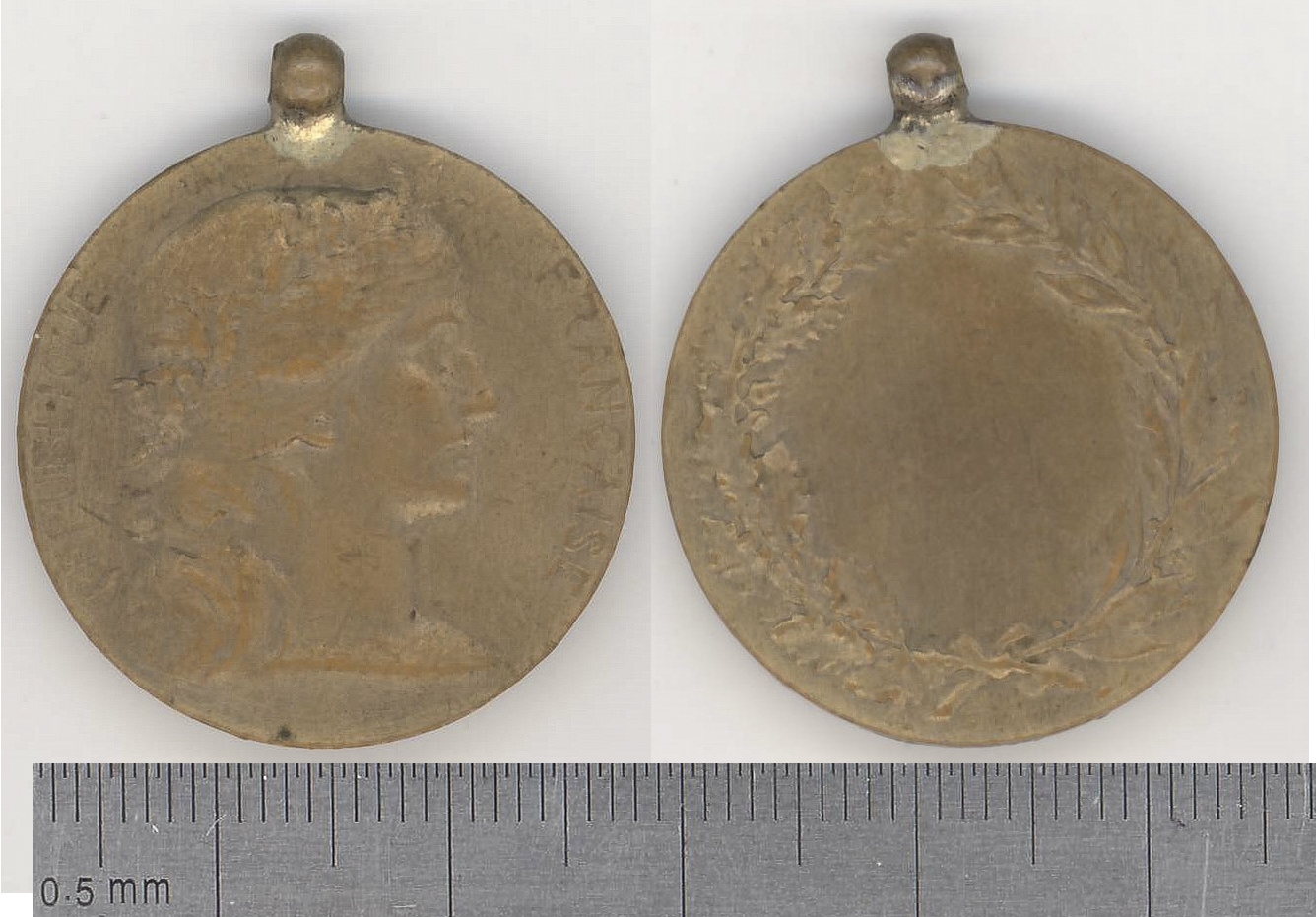 Avers: cap de femeie, profil drp - Marianne, cu cunună de lauri pe cap. Legendă: Republique Francaise. Revers :cunună împletită din ramuri de laur şi de stejar. Legendă: (inferior) numele autorului - Dubois. Muchie netedă.