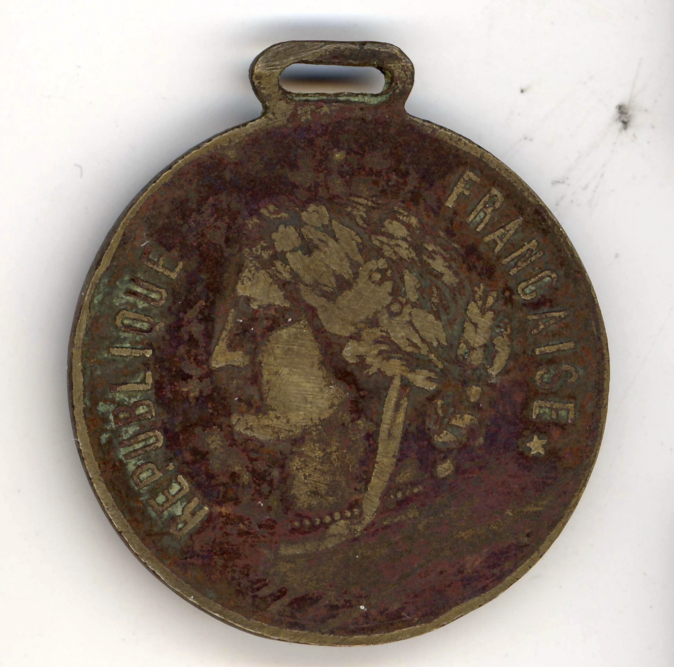 rotundă cu muchie netedă şi urechiuşă aplatizată. Avers: cap de femeie laureată, în profil stg; în jurul valorii sunt inscripţii. Revers: legenda în 3 rînduri între 2 crenguţe legate jos cu panglici.