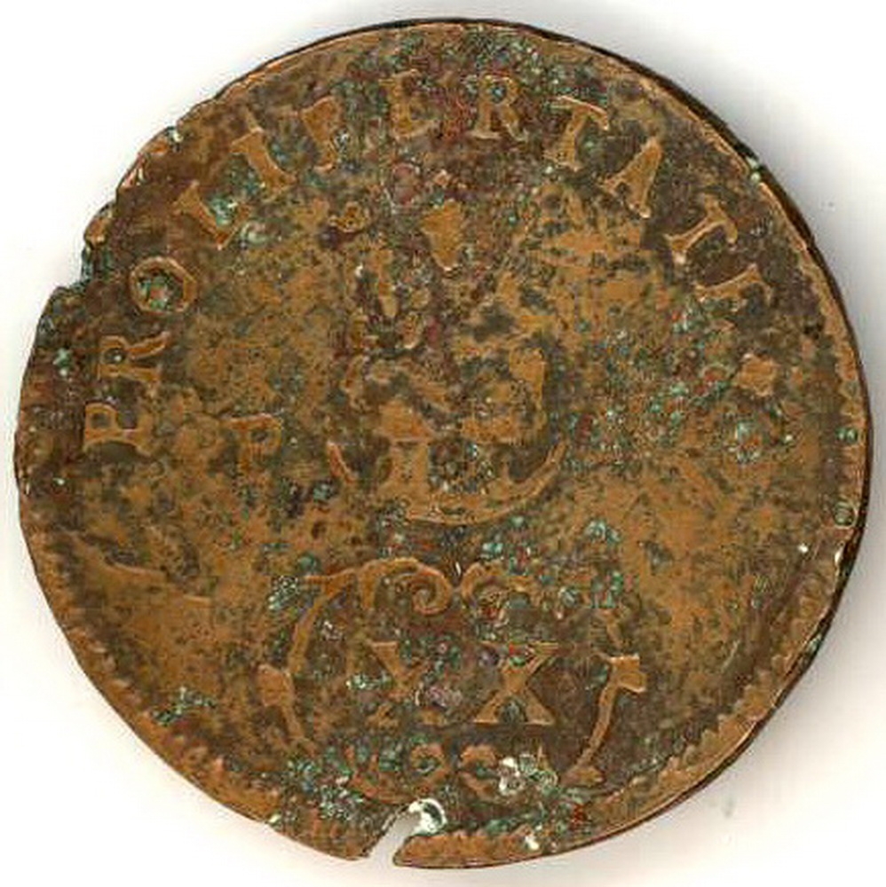 Revers: figură de femeie șezînd, la picioarele ei e o semilună; pa ambele părți - inițiale; sus în arc de cerc - inscripții; jos - 2 cifre romane.