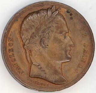 Avers: cap de bărbat în profil drp, laureat (efigia lui Napoleon); în jurul valorii - inscripții, sub tăietura gîtului - numele meșterului medalier.