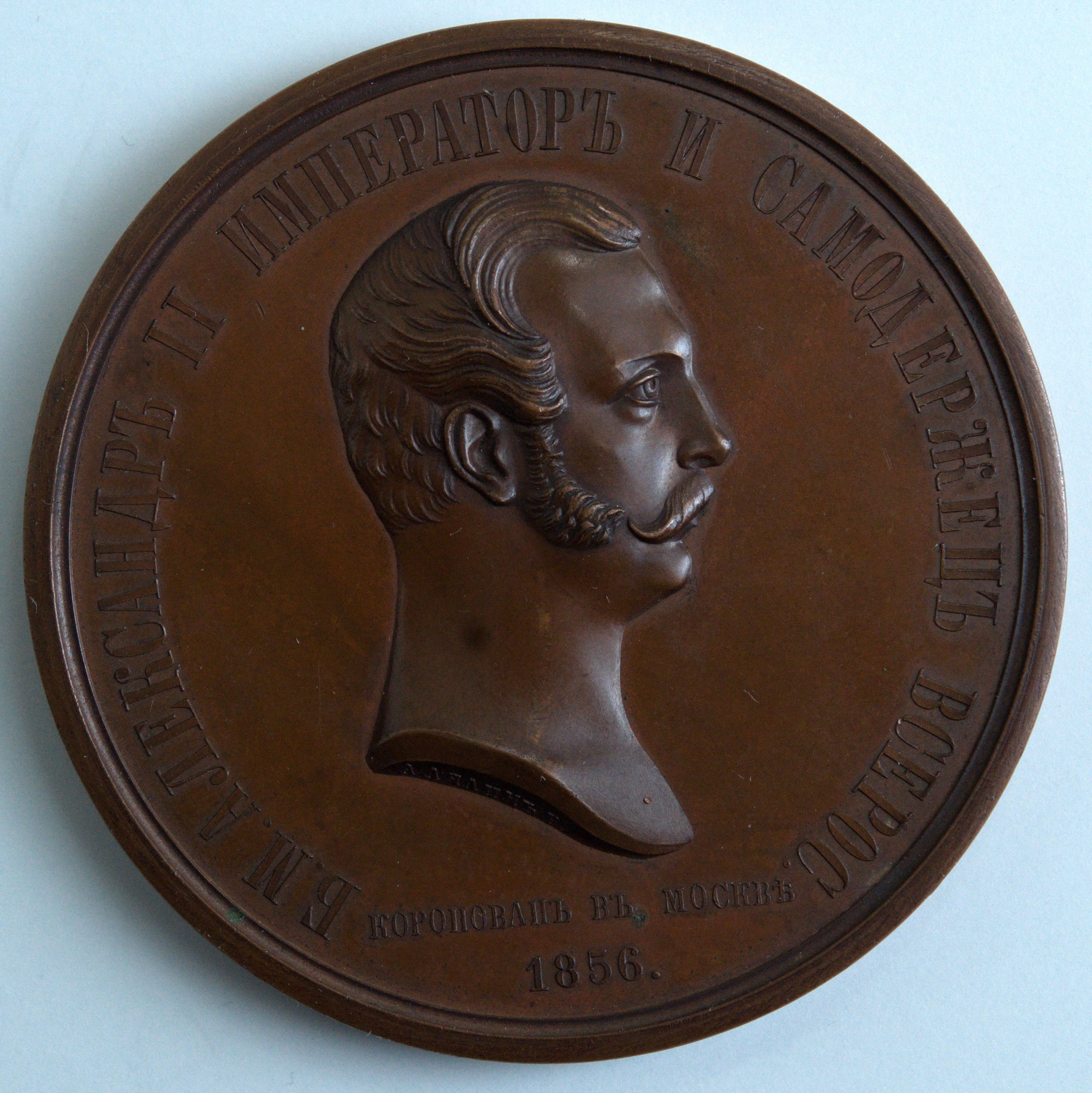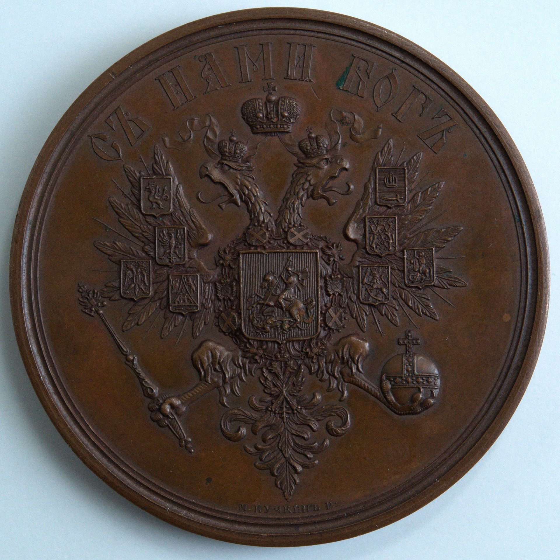 Medalie rotundă cu margine netedă. Avers: capul lui Alexandru II, în profil drp, pe margine - legenda şi milesimul. Revers: stema Imperiului Rus (acvilă bicefală, cu 3 coroane, cu sceptru şi sfera cruciferă), sus: С НАМИ БОГ.