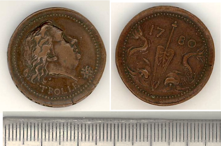 Avers: în cerc prelat - cap de bărbat de vîrstă medie profil drp, în drp jos - decoraţie. Legendă: trolle. Revers: în cerc prelat (centru) - un atribut care aminteşte de vîsla flancată de 2 delfini. Legendă: 1780. Muchie: inscripţie - Amiralitete...