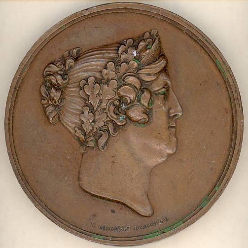rotundă cu muchie netedă. Avers: portret de femeie laureată cu păr adunat în coc, în profil drp, marginal jos - numele meșterului medalier. Revers: la centru între două cununi vegetale - milesimul timbrat sus de inscripții, inferior de inițiale.
