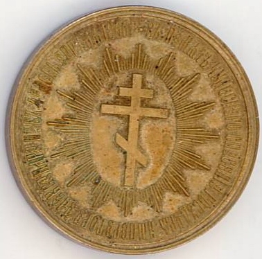 rotundă cu muchie netedă. Avers: efigia comisarului Kostromskii, anfas; sus în arc - inscripții. Revers: cruce patriarhală la centru, radiantă, conturată de inscripții.