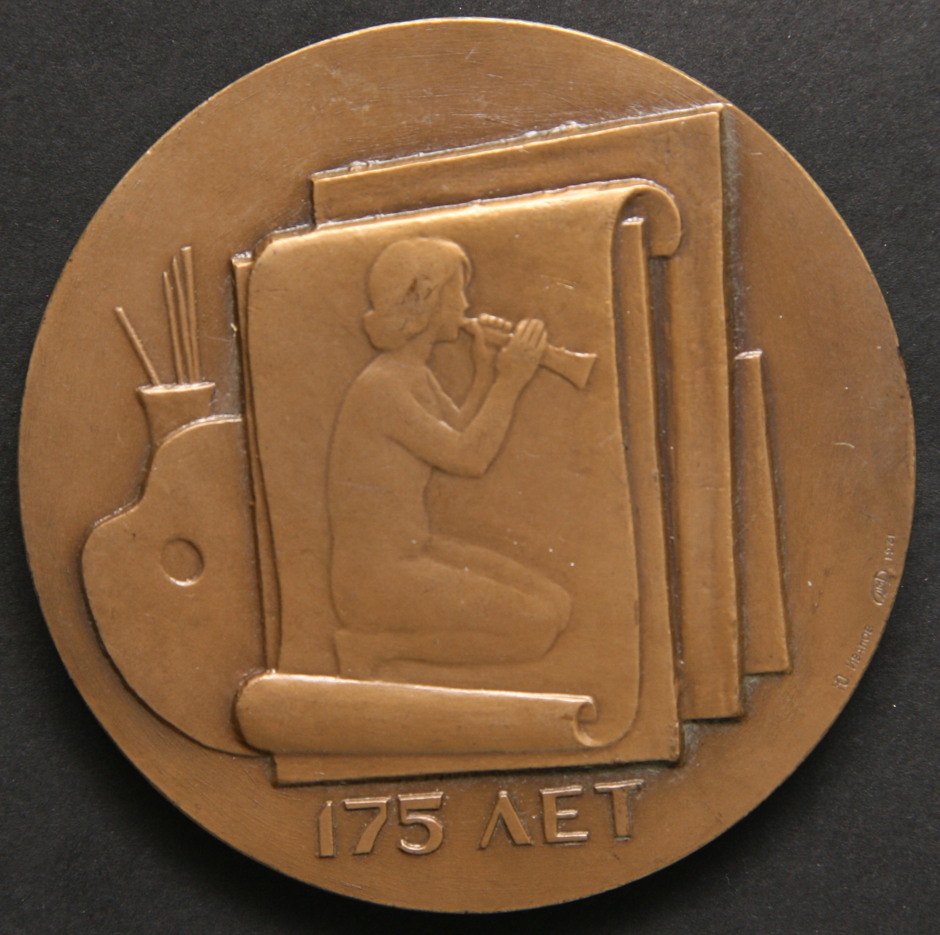 Revers: diferite atribute ale artei: în prim plan pe o coală de hîrtie e imaginea unui tînăr cîntînd la instrument muzical, jos într-un rînd - inscripții, margine drp - numele meșterului medalier.