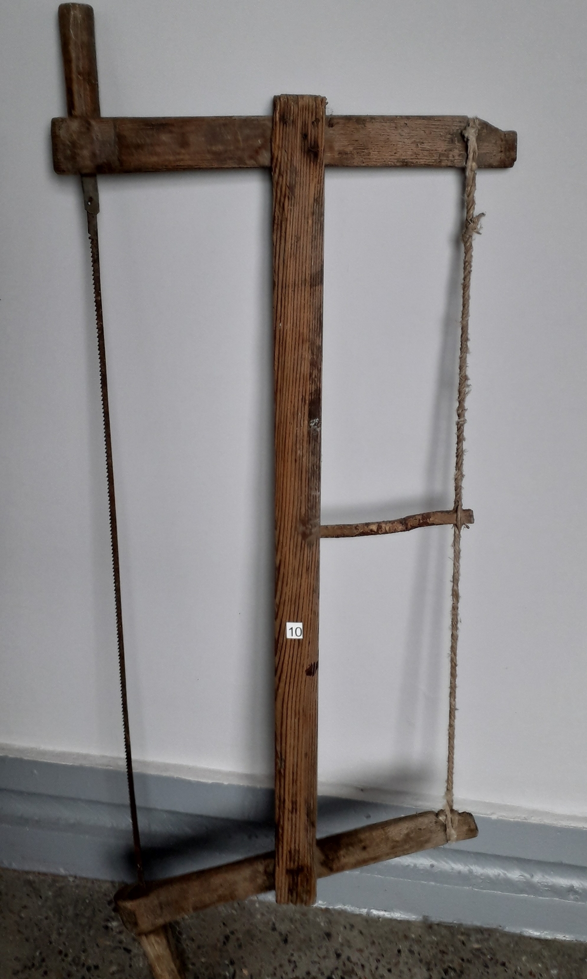 Unealtă pentru lemnărit prevăzută cu o lamă de oțel cu dinți ascuțiți;cu două mnere de lemn,care sunt prinse la mijloc cu o vergea de lemn pentru rezistență și comoditate de a pune în mișcare manual unealta;capetele mânerelor,în partea superioară sunt prinse cu o sfoară.Cromatica:culoarea lemnului vechi,lamă ruginită.
