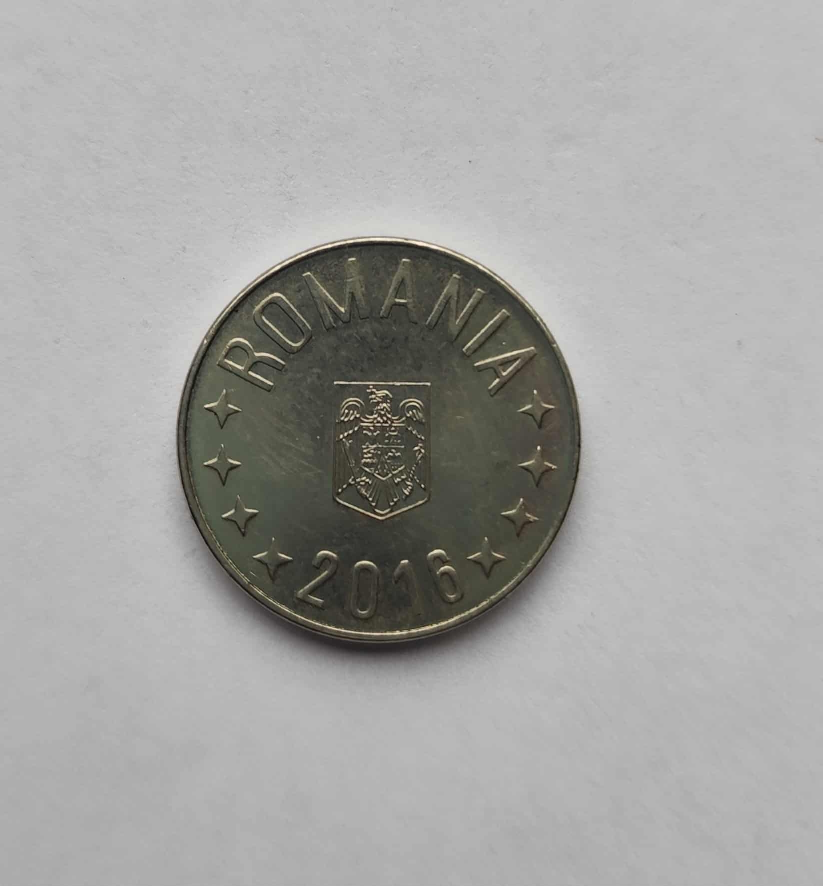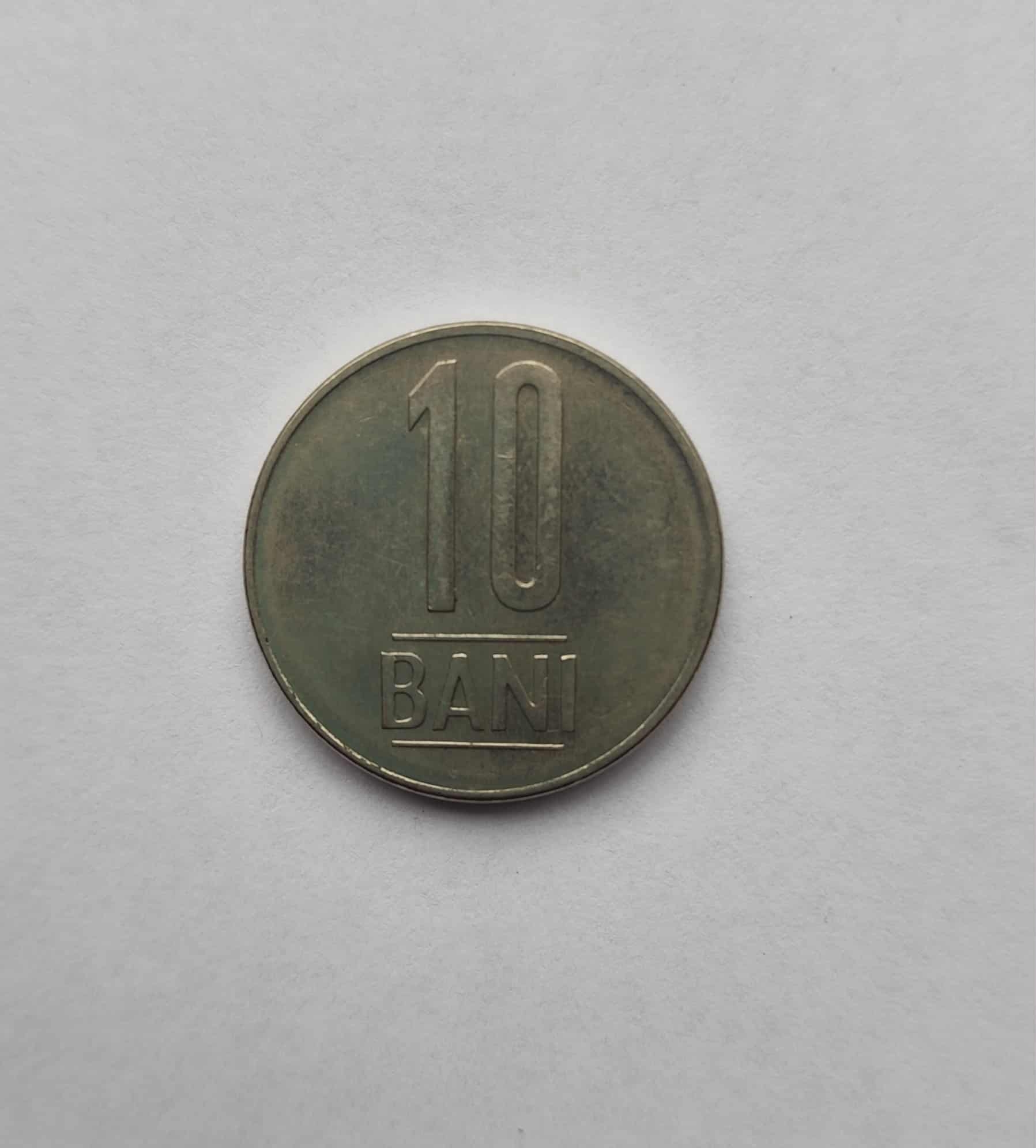 Moneda de formă circulară cu muchia netedă și valoarea nominală de 10 bani din România. Reversul monedei are pe circumferința superioară inscripționat cu majuscule numele țării emitente: ROMANIA. În centru se află Stema României, reprezentând acvila (vulturul) cruciată, având în cioc o cruce și ținând în gheare un sceptru și o spadă. Sub stemă este marcat anul emiterii monedei: 2016. Circumferențial în jurul stemei și a anului sunt distribuite un număr de 12 stele, simbolizând Uniunea Europeană și aspirațiile europene ale României. Pe aversul monedei valoarea nominală în partea superioară este inscripționată cu cifra mare 10.