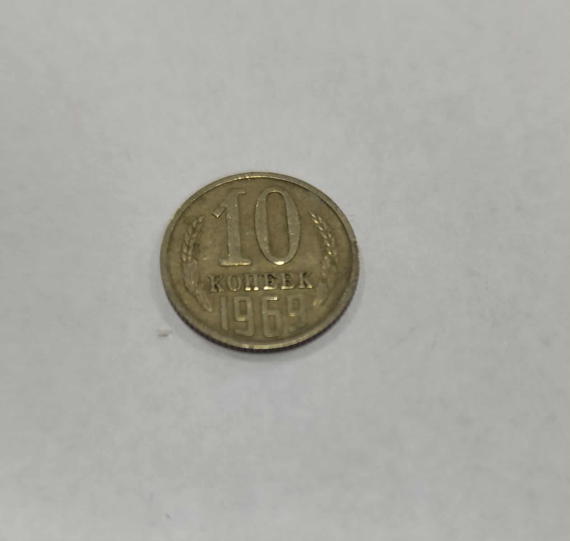 Monedă de formă rotundă care pe revers are stema Uniunii Sovietice, formată dintr-o seceră și un ciocan, simboluri ale unității muncitorilor și țăranilor, așezate pe globul pământesc. În spatele globului se ridică un soare, iar totul este înconjurat de două spice de grâu legate la bază cu o panglică pe care scrie CCCP (abrevierea pentru Uniunea Republicilor Socialiste Sovietice, în rusă). Deasupra stemei se află o stea cu cinci colțuri. Pe areversul monedei sunt inscripționate valoarea nominală 10 , iar sub el scrie КОПЕЕК (Kopeek), care înseamnă copeici. Sub valoare este anul de emisiune: 1969. Toate aceste elemente sunt înconjurate de două spice de grâu.
