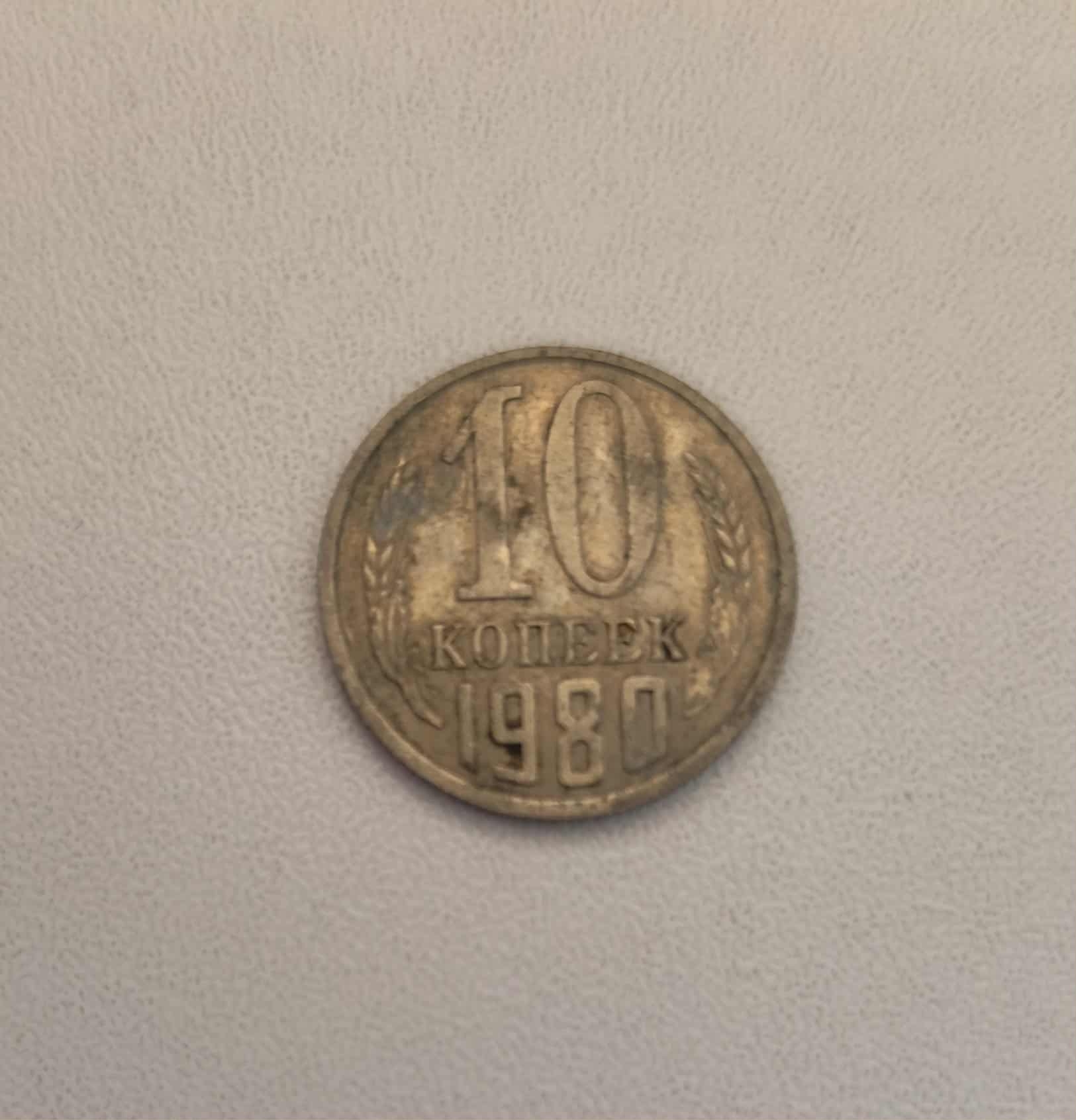 Monedă de formă rotundă care pe revers are stema Uniunii Sovietice, formată dintr-o seceră și un ciocan, simboluri ale unității muncitorilor și țăranilor, așezate pe globul pământesc. În spatele globului se ridică un soare, iar totul este înconjurat de două spice de grâu legate la bază cu o panglică pe care scrie CCCP (abrevierea pentru Uniunea Republicilor Socialiste Sovietice, în rusă). Deasupra stemei se află o stea cu cinci colțuri. Pe aversul monedei sunt inscripționate valoarea nominală 10 , iar sub el scrie КОПЕЕК (Kopeek), care înseamnă copeici. Sub valoare este anul de emisiune: 1980. Toate aceste elemente sunt înconjurate de două spice de grâu.