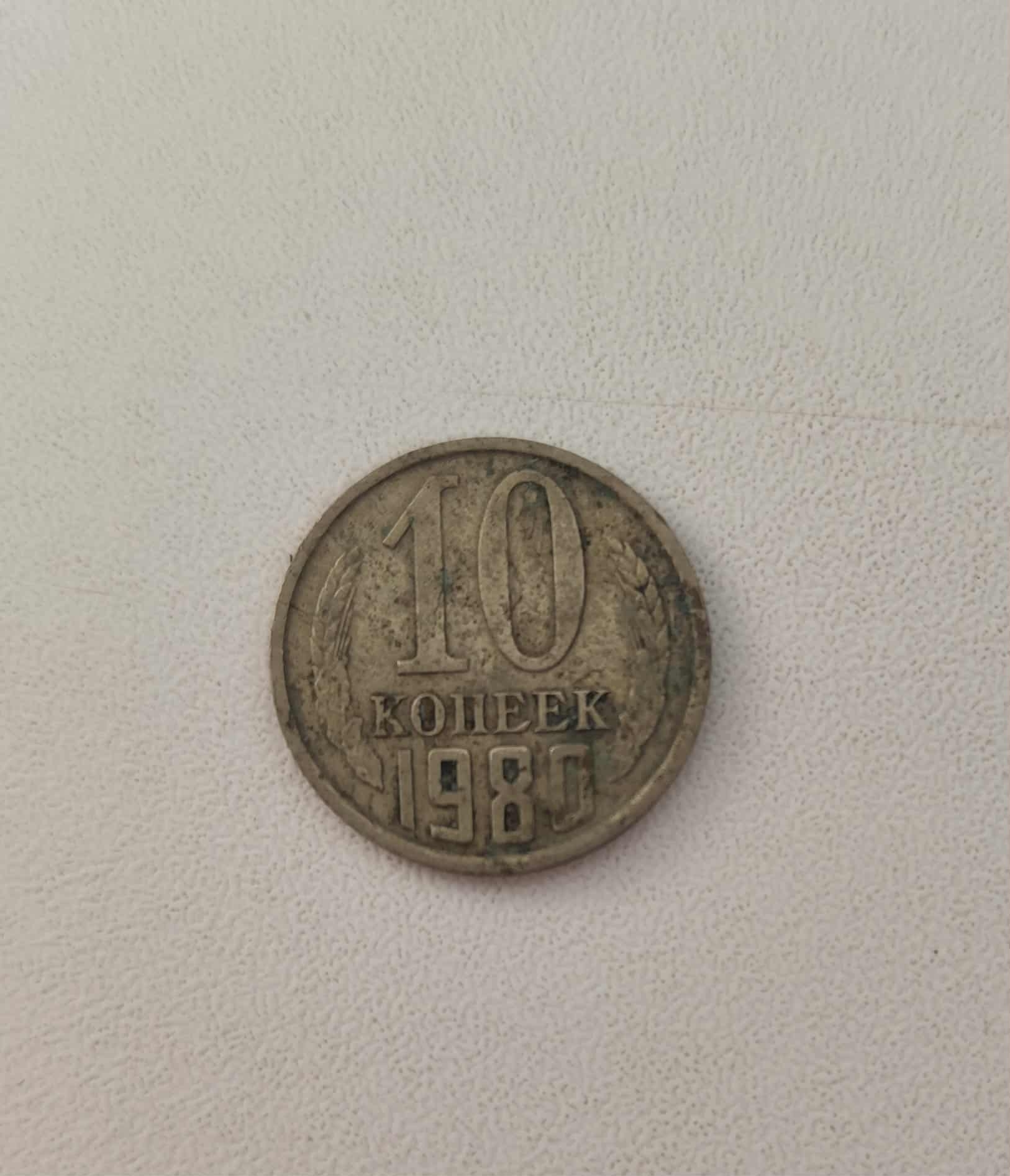Monedă de formă rotundă care pe revers are stema Uniunii Sovietice, formată dintr-o seceră și un ciocan, simboluri ale unității muncitorilor și țăranilor, așezate pe globul pământesc. În spatele globului se ridică un soare, iar totul este înconjurat de două spice de grâu legate la bază cu o panglică pe care scrie CCCP (abrevierea pentru Uniunea Republicilor Socialiste Sovietice, în rusă). Deasupra stemei se află o stea cu cinci colțuri. Pe aversul monedei sunt inscripționate valoarea nominală 10 , iar sub el scrie КОПЕЕК (Kopeek), care înseamnă copeici. Sub valoare este anul de emisiune: 1980. Toate aceste elemente sunt înconjurate de două spice de grâu.