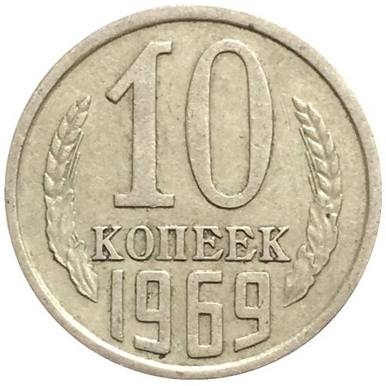 Monedă de formă rotundă care pe revers are stema Uniunii Sovietice, formată dintr-o seceră și un ciocan, simboluri ale unității muncitorilor și țăranilor, așezate pe globul pământesc. În spatele globului se ridică un soare, iar totul este înconjurat de două spice de grâu legate la bază cu o panglică pe care scrie CCCP (abrevierea pentru Uniunea Republicilor Socialiste Sovietice, în rusă). Deasupra stemei se află o stea cu cinci colțuri. Pe aversul monedei sunt inscripționate valoarea nominală 10 , iar sub el scrie КОПЕЕК (Kopeek), care înseamnă copeici. Sub valoare este anul de emisiune: 1969. Toate aceste elemente sunt înconjurate de două spice de grâu.